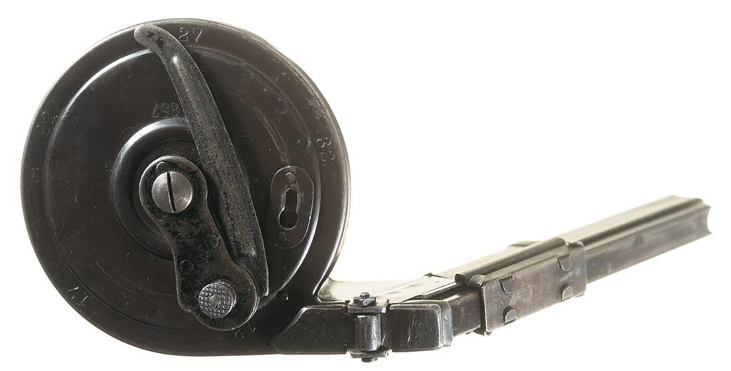 Matching "239857" numbers on top and bottom, folding winding lever, and a reinforcing collar for use with a MP-18 SMG. Good overall.