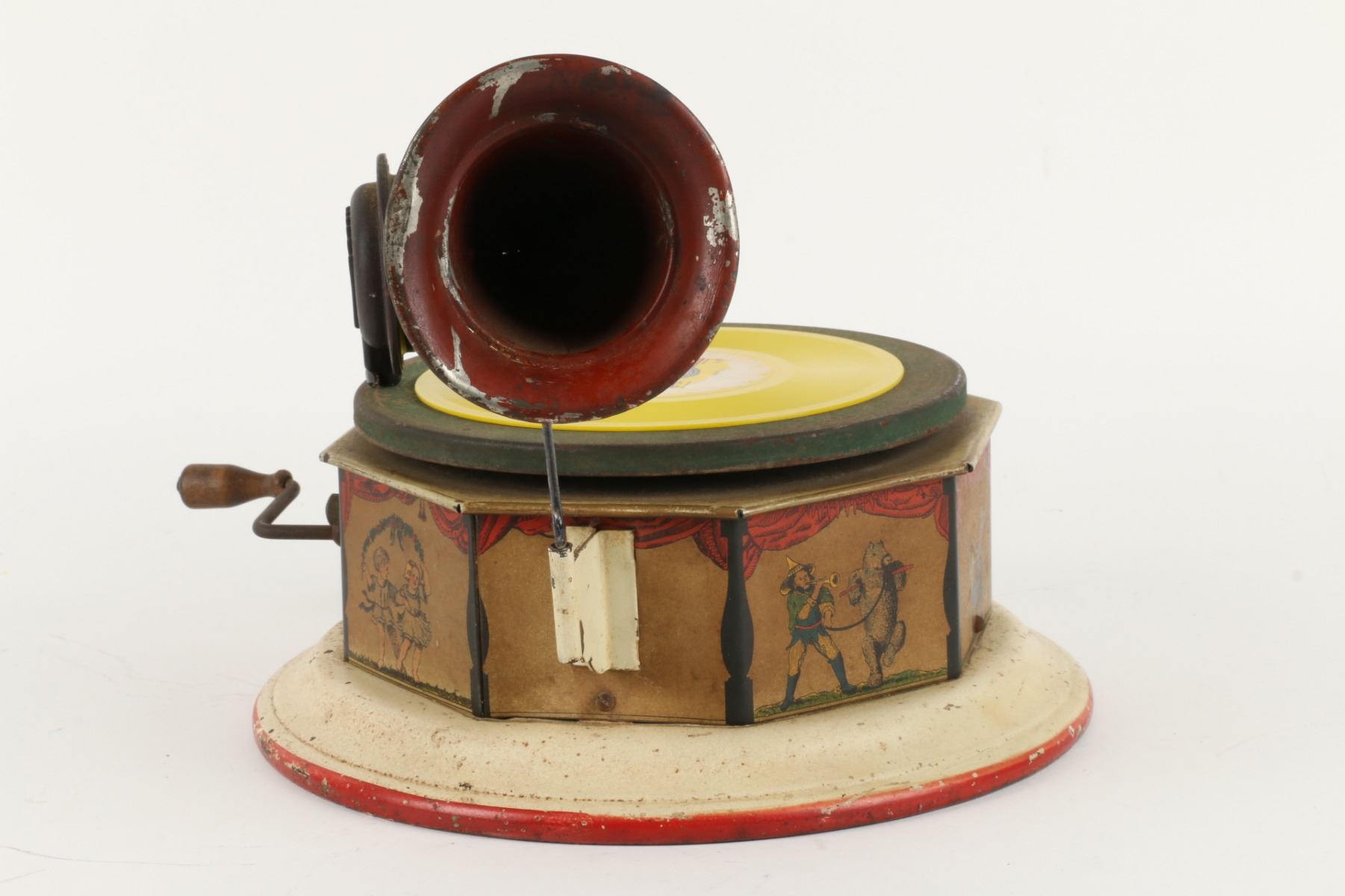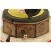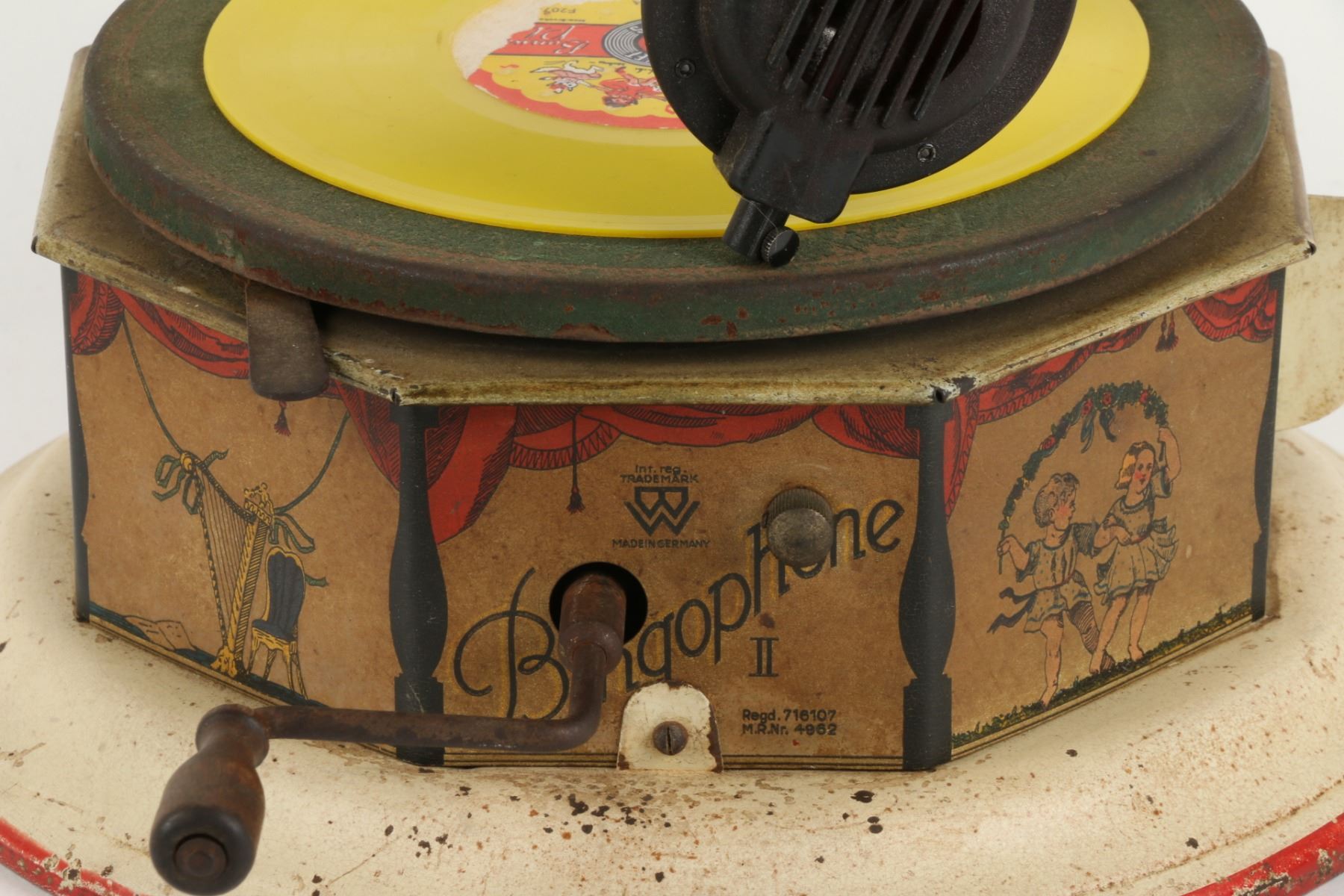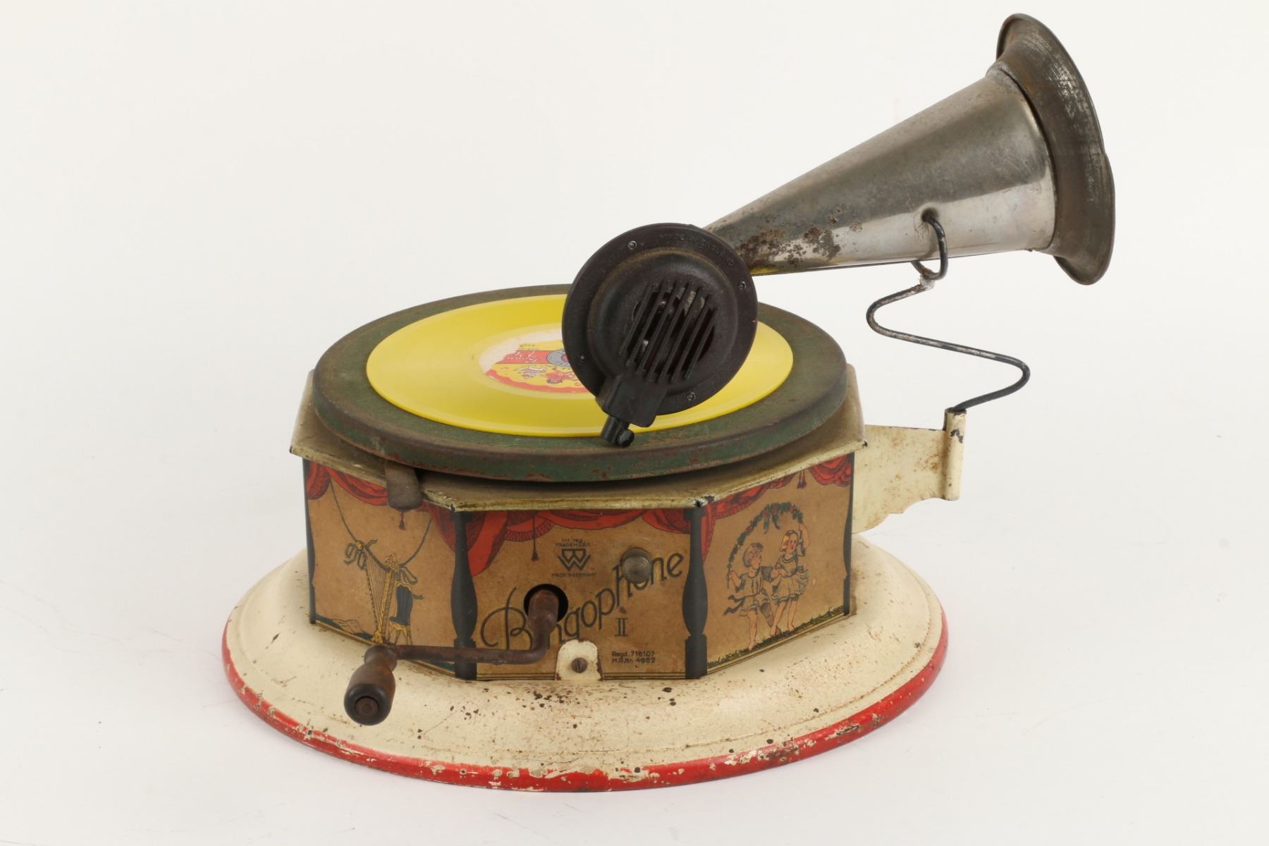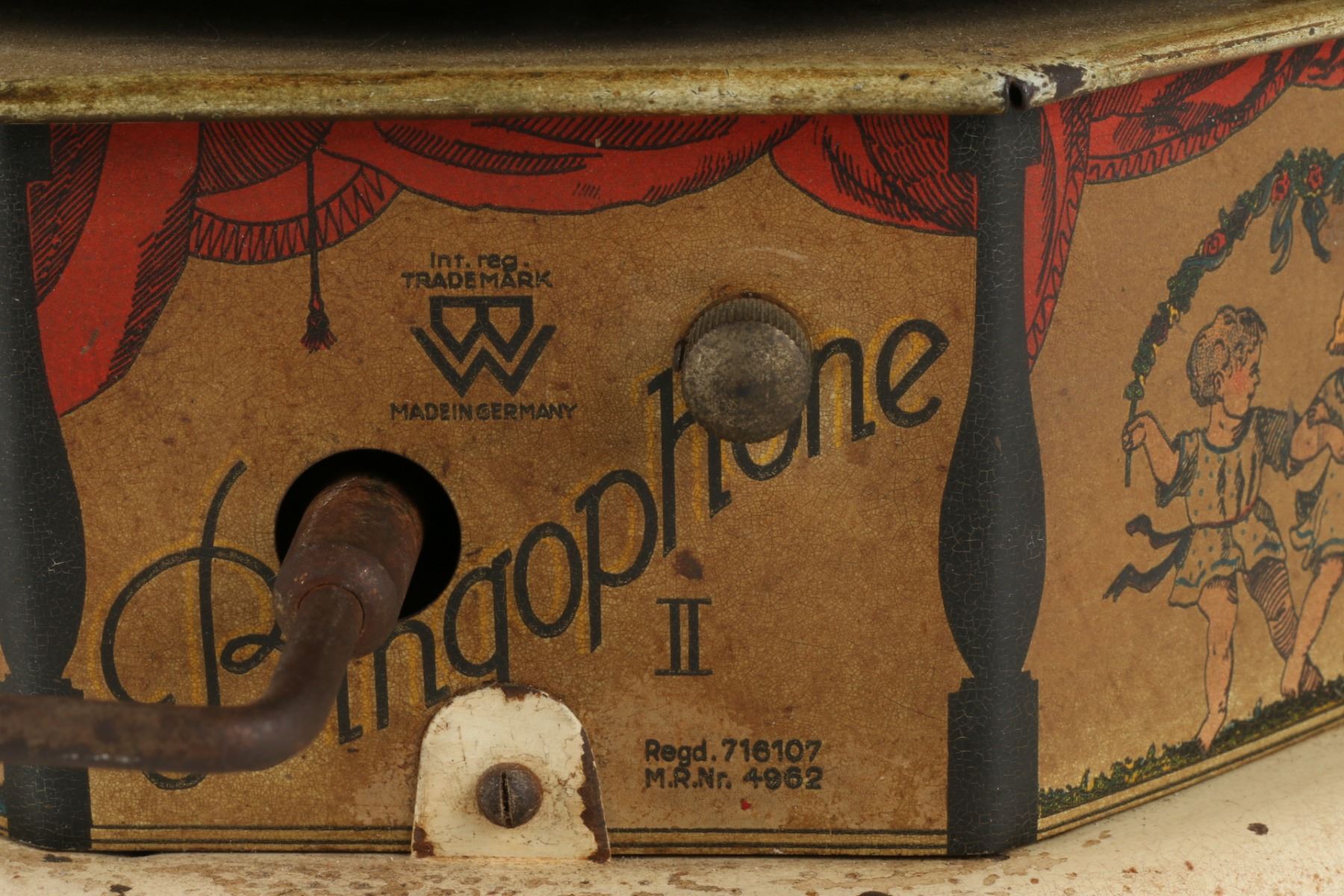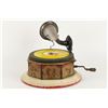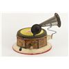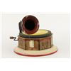 German. Circa 1920. "Bingophone II" by Bing Toys, Germany. Tin lithograph body. Includes crank and small horn. 10" x 10" x 5". Minor flakes to lithographed surface. Later English reproducer. Includes suitable colour disk. Functioning. $100-200.