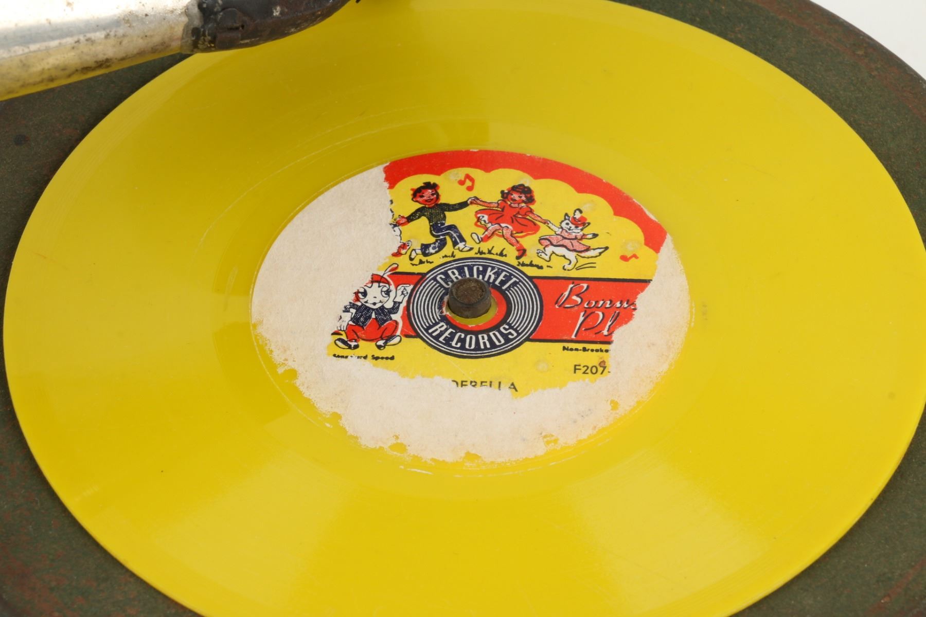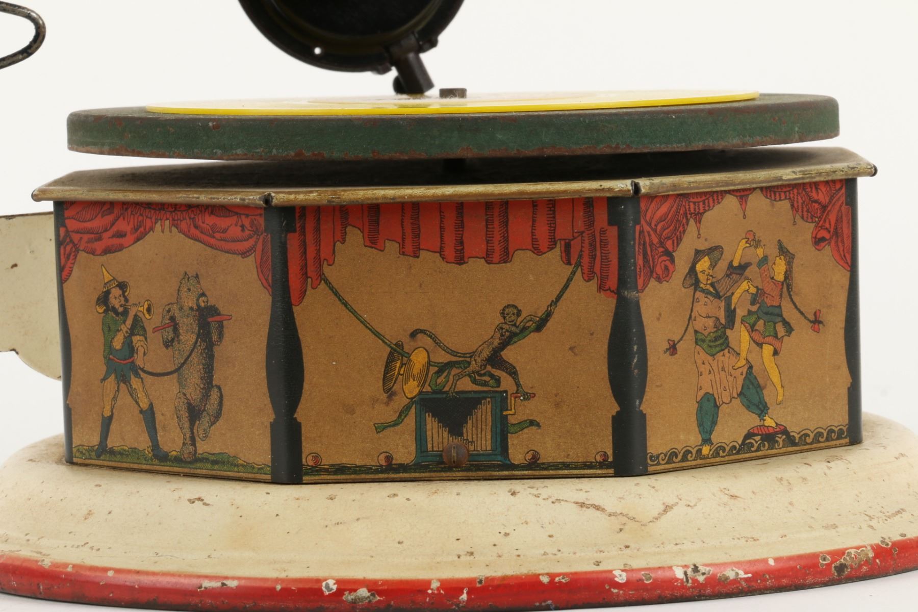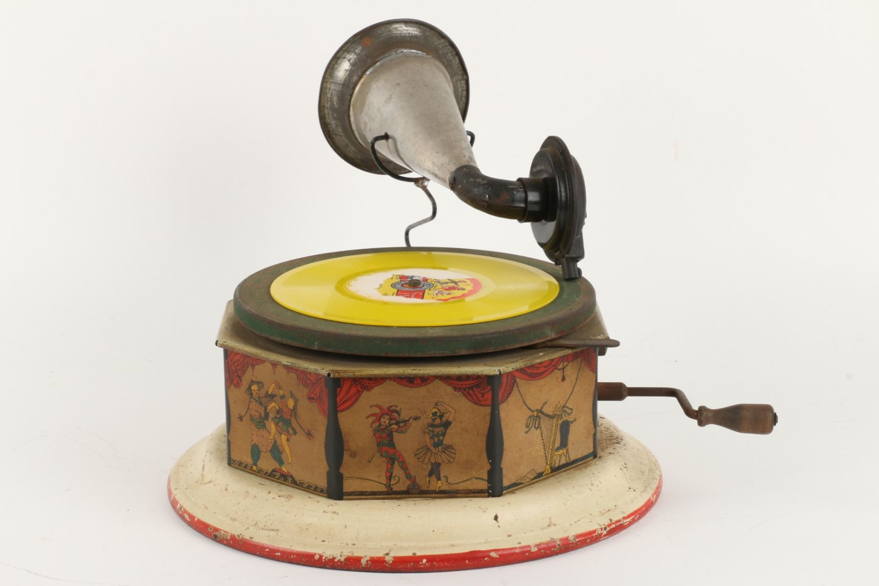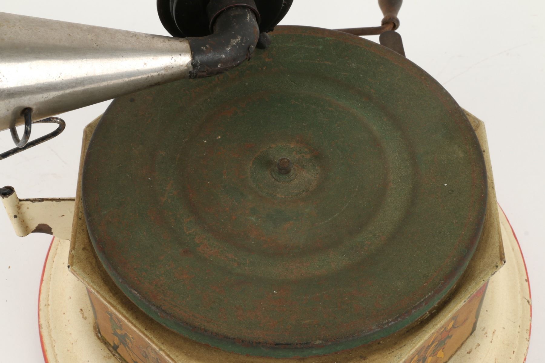 German. Circa 1920. "Bingophone II" by Bing Toys, Germany. Tin lithograph body. Includes crank and small horn. 10" x 10" x 5". Minor flakes to lithographed surface. Later English reproducer. Includes suitable colour disk. Functioning. $100-200.