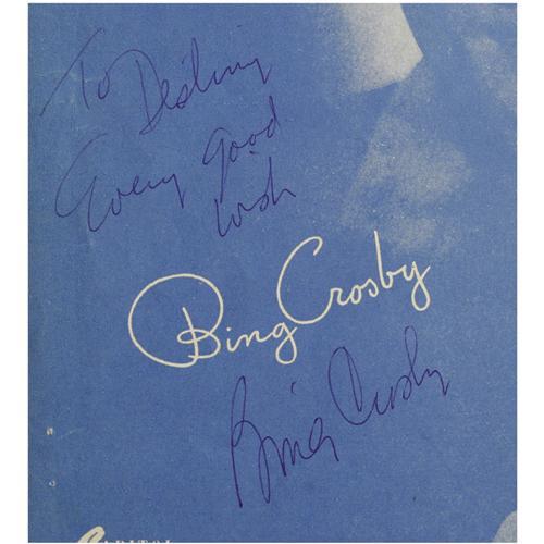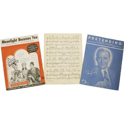 <B>Bing Crosby, Bob Hope, and Dorothy Lamour Signed Sheet Music.</B></I> Includes a copy of the sheet music for "Moonlight Becomes You" from the movie <I>Road to Morocco,</B></I> signed on the front cover by stars Bing Crosby, Bob Hope, and Dorothy Lamour; plus sheet music for "Pretending" signed by Crosby on the front cover. Both are in overall Fine condition with moderate wear and some tanning.<BR><BR><b>Shipping:</b> Flat Material, Small (<a target="_blank" href="http://www.heritageauctions.com/common/shipping.php">view shipping information</a>)