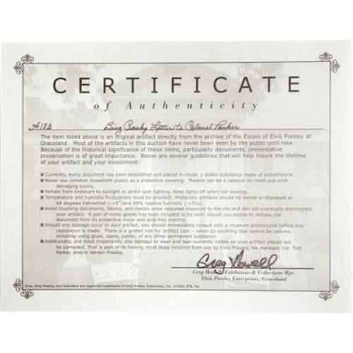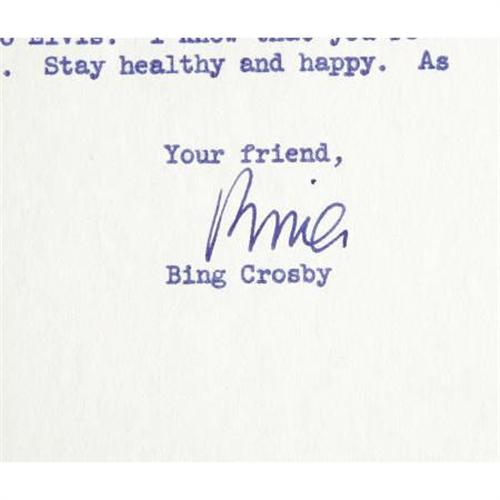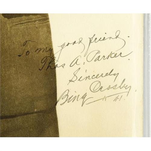 <B>Bing Crosby Signed Photo and Letter to Colonel Tom Parker.</B></I> A two-page typed letter on personal letterhead, dated May 13, 1957, from crooner Bing Crosby to Elvis' manager, Colonel Tom Parker, signed by Crosby in blue ink. It reads in part: "Thank you so much for your recent letter. I am happy that you were pleased with what I had to say about your young man, Elvis Presley. I honestly think he's a great performer and under your astute guidance, he's going to be a big star for a long time." Crosby continues by discussing cigars, how difficult it is to get money out of Bob Hope, and how crooners have begun to fall out of favor with the studios. Also included is a b&w 8" x 10" photo of Crosby inscribed to Parker and signed by the singer in black ink. The letter is in Excellent condition with a mailing crease, and the photo is in Fine to Very Fine condition with moderate toning, some wear to the corners, and s tape stain to the top edge. <I>Accompanied by a certificate of authenticity from Graceland.</B></I><BR><BR><b>Shipping:</b> Flat Material, Small (<a target="_blank" href="http://www.heritageauctions.com/common/shipping.php">view shipping information</a>)