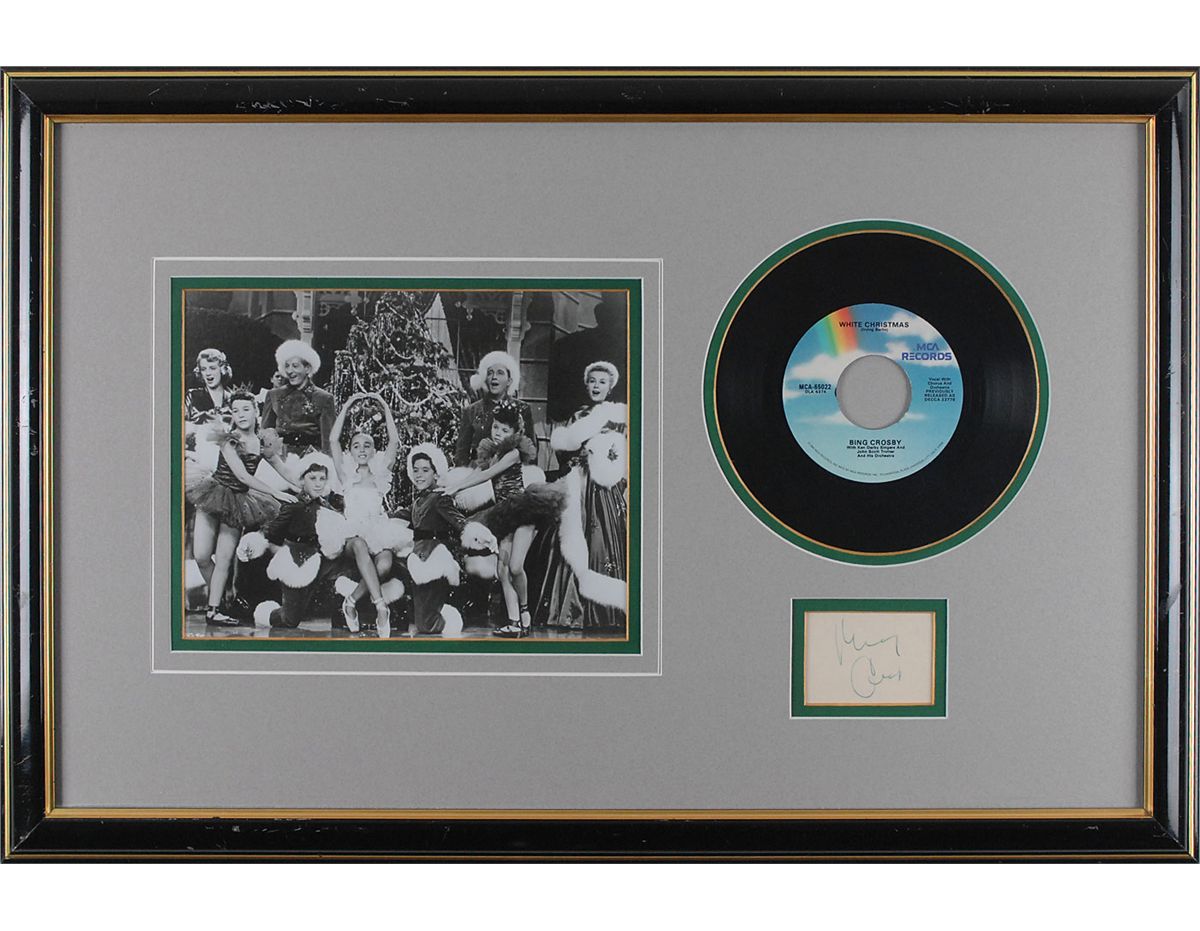 Vintage ink signature, “Bing Crosby,” on an off-white card. Double-matted and framed with a photo from White Christmas and a 45 rpm single of ‘White Christmas’ to an overall size of 24 x 16. In fine condition.