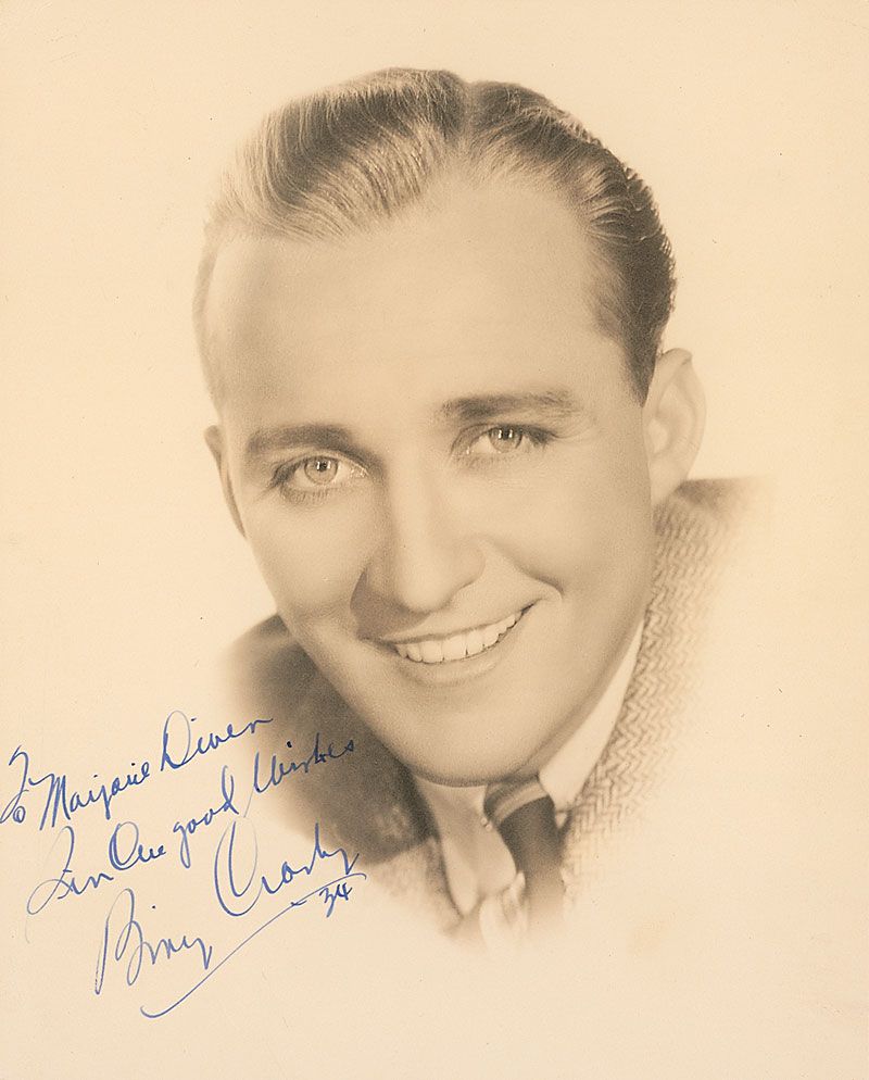 Vintage matte-finish 8 x 9.75 photo, signed and inscribed in fountain pen, “To Marjorie Diven, sincere good wishes, Bing Crosby ’34.” In fine condition.