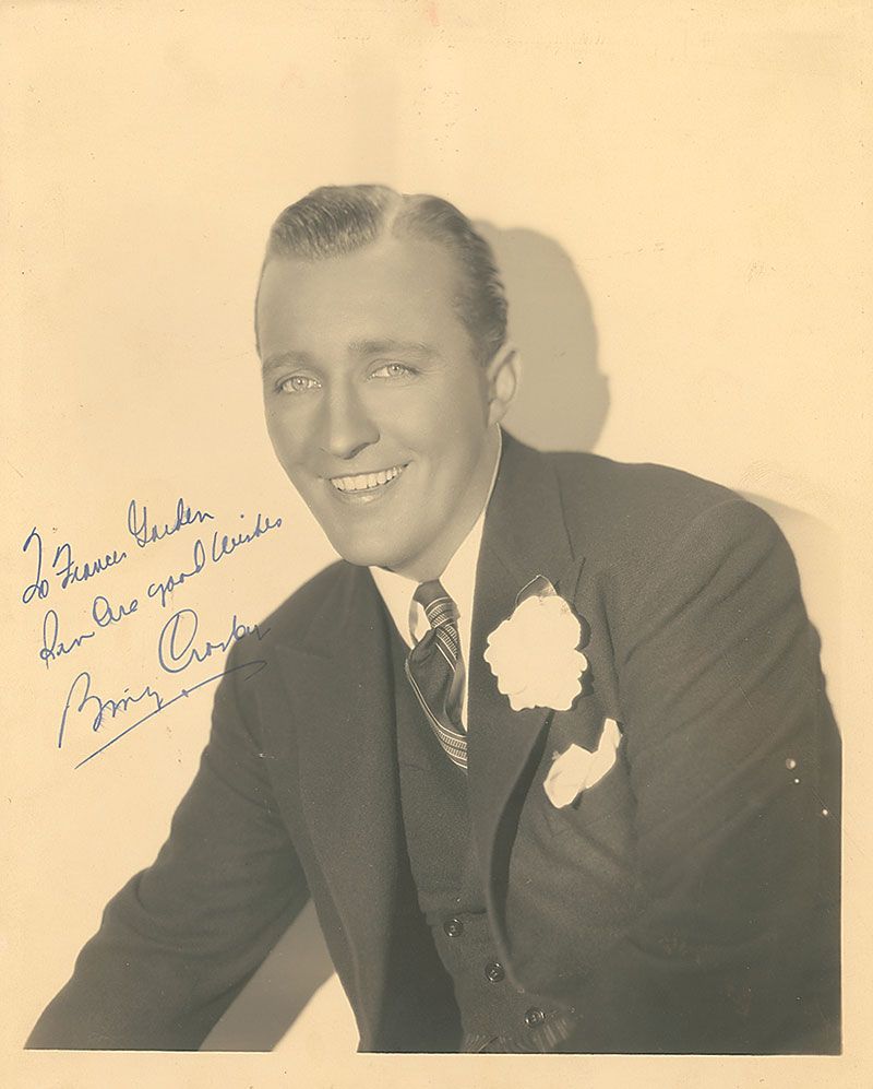 Vintage matte-finish 8 x 10 photo of Crosby in a boutonniere-adorned suit, signed and inscribed in fountain pen, “To Frances Garden, Sincere good wishes, Bing Crosby.” In fine condition, with some scattered surface marks and a subtle brush to signature.