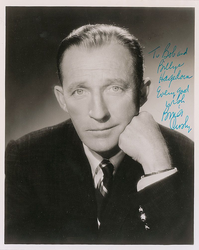 Vintage matte-finish 8 x 10 photo, signed and inscribed in fountain pen, “To Bob and Billye Hagedorn, Every good wish, Bing Crosby.” In fine condition, with some mild rippling to horizontal edges.