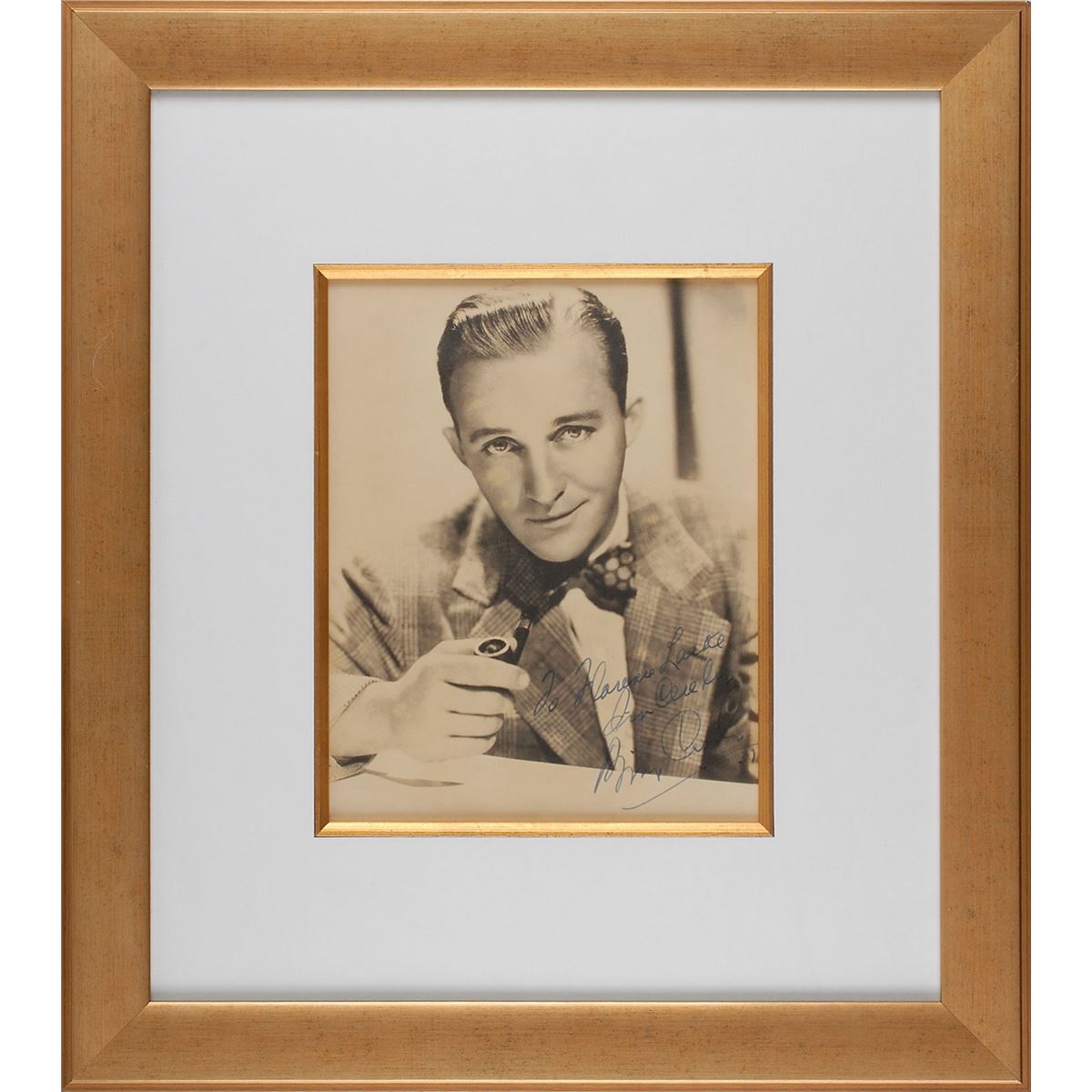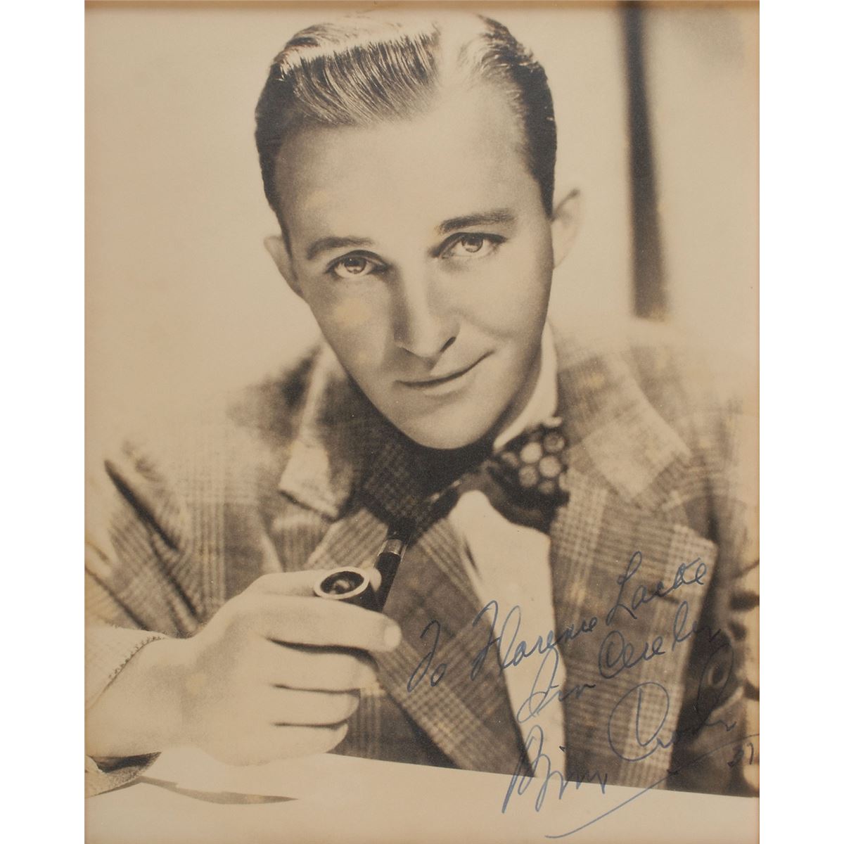 Handsome vintage matte-finish 7.25 x 9.25 photo of Crosby holding a smoking pipe, signed and inscribed in fountain pen, “To Florence Lacke, Sincerely, Bing Crosby, ‘37.” Matted and framed to an overall size of 16.5 x 18.5. In fine condition, with light scattered spots of toning and fair contrast to the last name against his suit.