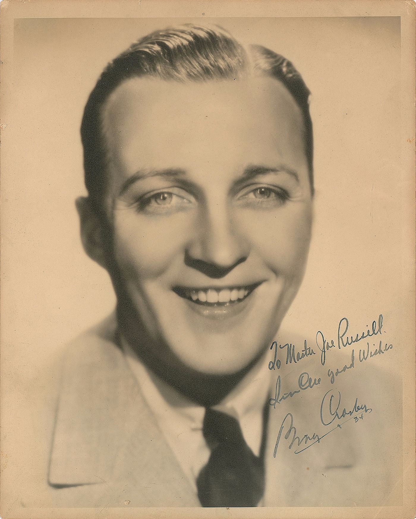 Vintage matte-finish 8 x 10 close-up portrait of Crosby, signed and inscribed in fountain pen, "To Martin Joe Russell, Sincere good wishes, Bing Crosby, '34.” In fine condition, with light toning, a crease to the lower right corner, and a small tack hole to the top border.