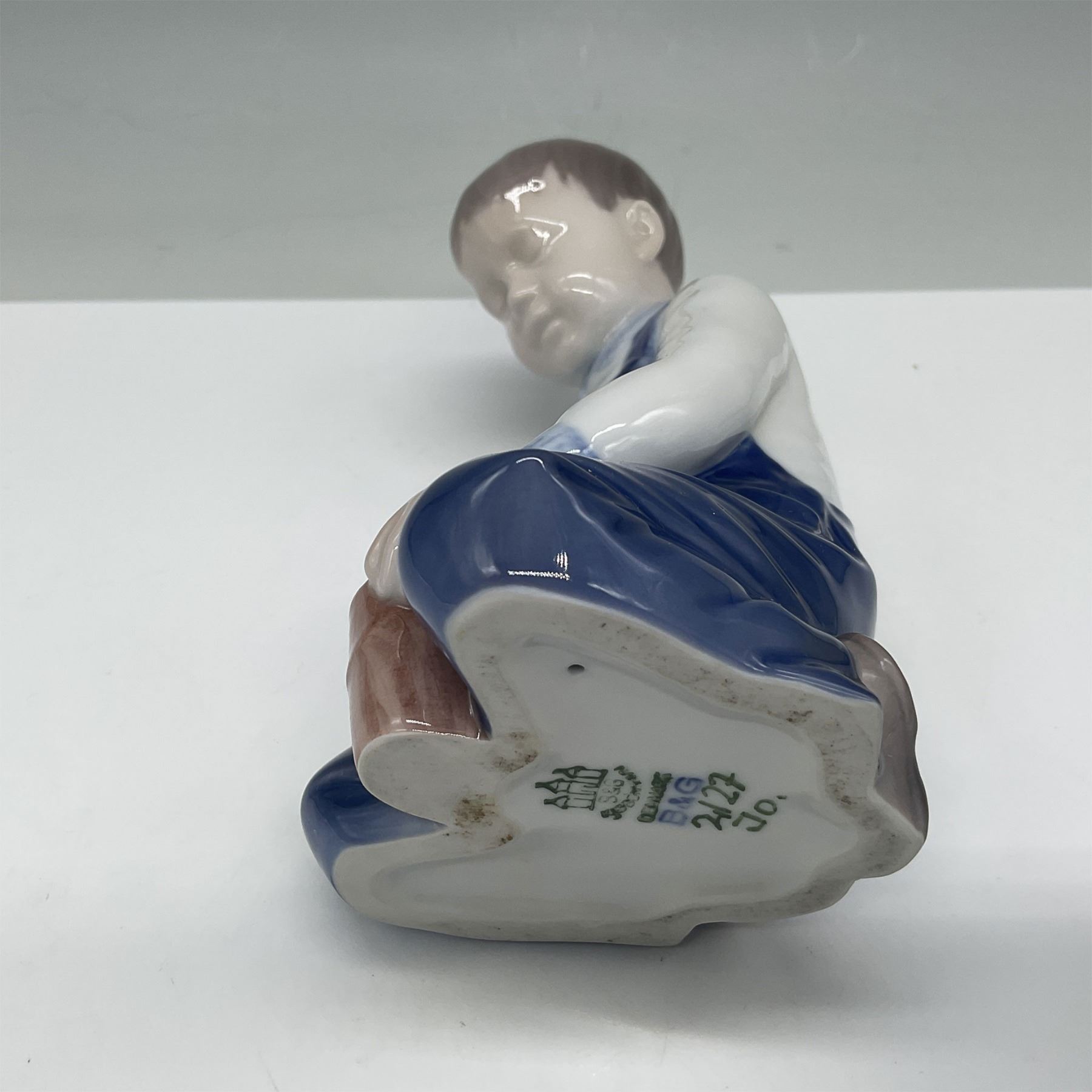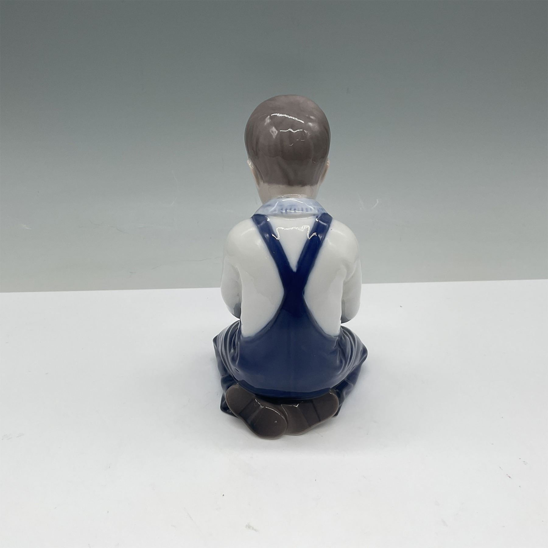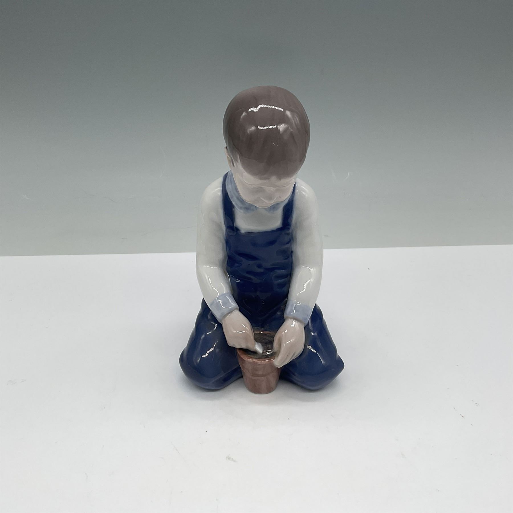 Bing & Grondahl porcelain figurine titled Boy with Sand Bucket, model number 2127. This figurine features a young boy kneeling with a small copper-toned bucket, dressed in blue overalls and a white shirt. Crafted in Denmark, the piece showcases Bing & Grondahl hallmark attention to detail and delicate hand-painted features. The underside bears the Bing & Grondahl mark and the model number for authenticity.