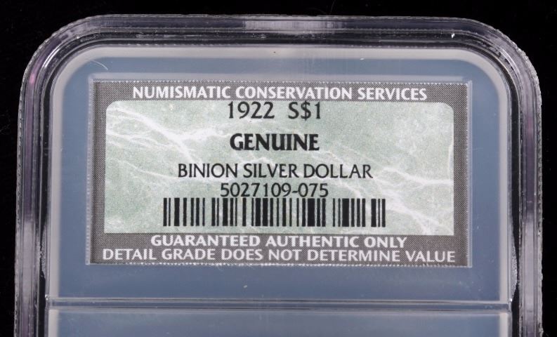 This lot features a Binion Collection 1922 Silver Dollar. After his death, it was discovered by Nye County sheriff's deputies that Ted had had a 12-foot-deep vault built on the desert floor on a piece of property he owned in Pahrump, 60 miles west of Las Vegas. The concrete bunker contained six tons of silver bullion, Horseshoe Casino chips, paper currency, and more than 100,000 rare coins, including Carson City silver dollar many in mint condition estimated to be worth between $7 million and $14 million that were once housed in the Horseshoe vault. Lonnie Theodore "Ted" Binion (November 28, 1943 – September 17, 1998) was a wealthy U.S. gambling executive and one of the sons of famed Las Vegas casino magnate Lester Ben "Benny" Binion, owner of Binion's Horseshoe. His death has been a subject of controversy; girlfriend Sandra Murphy and her lover Rick Tabish were initially charged and convicted in Binion's death, but were later granted a new trial and acquitted on the murder charges. This piece is in good condition for its age. This is a NCS Coin. It measures 3 3/8" L x 2 3/8" W