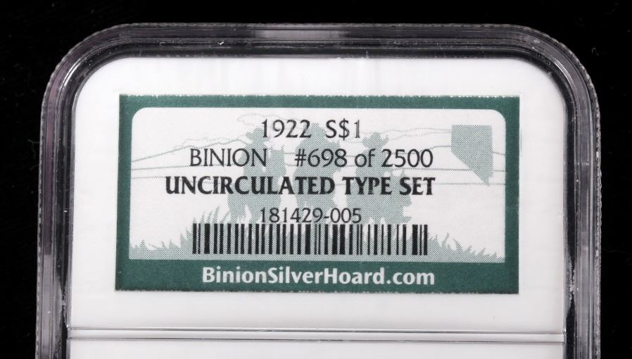 This lot features a Binion Collection 1922 Silver Dollar Uncirculated Type Set #698 of 2500. After his death, it was discovered by Nye County sheriff's deputies that Ted had had a 12-foot-deep vault built on the desert floor on a piece of property he owned in Pahrump, 60 miles west of Las Vegas. The concrete bunker contained six tons of silver bullion, Horseshoe Casino chips, paper currency, and more than 100,000 rare coins, including Carson City silver dollar many in mint condition estimated to be worth between $7 million and $14 million that were once housed in the Horseshoe vault. Lonnie Theodore "Ted" Binion (November 28, 1943 – September 17, 1998) was a wealthy U.S. gambling executive and one of the sons of famed Las Vegas casino magnate Lester Ben "Benny" Binion, owner of Binion's Horseshoe. His death has been a subject of controversy; girlfriend Sandra Murphy and her lover Rick Tabish were initially charged and convicted in Binion's death, but were later granted a new trial and acquitted on the murder charges. This piece is in good condition for its age. This is a NGC Coin. It measures 3 3/8" L x 2 3/8" W