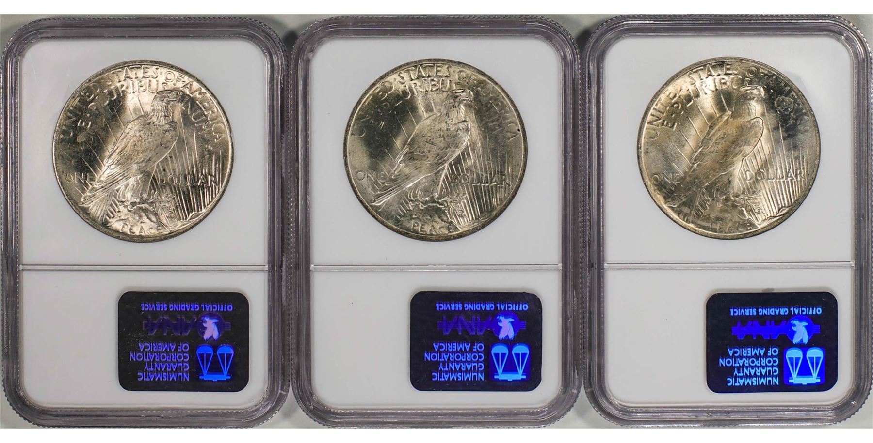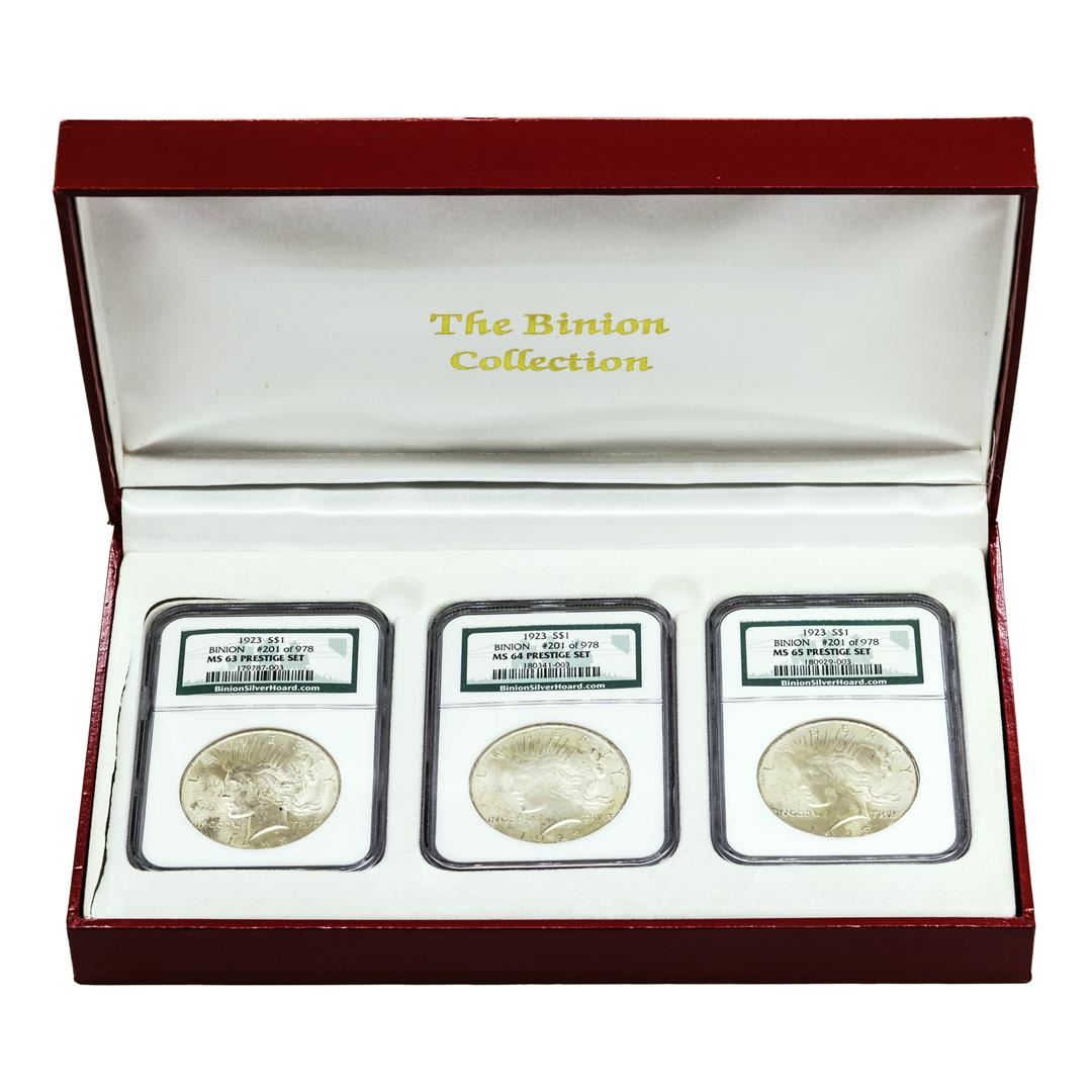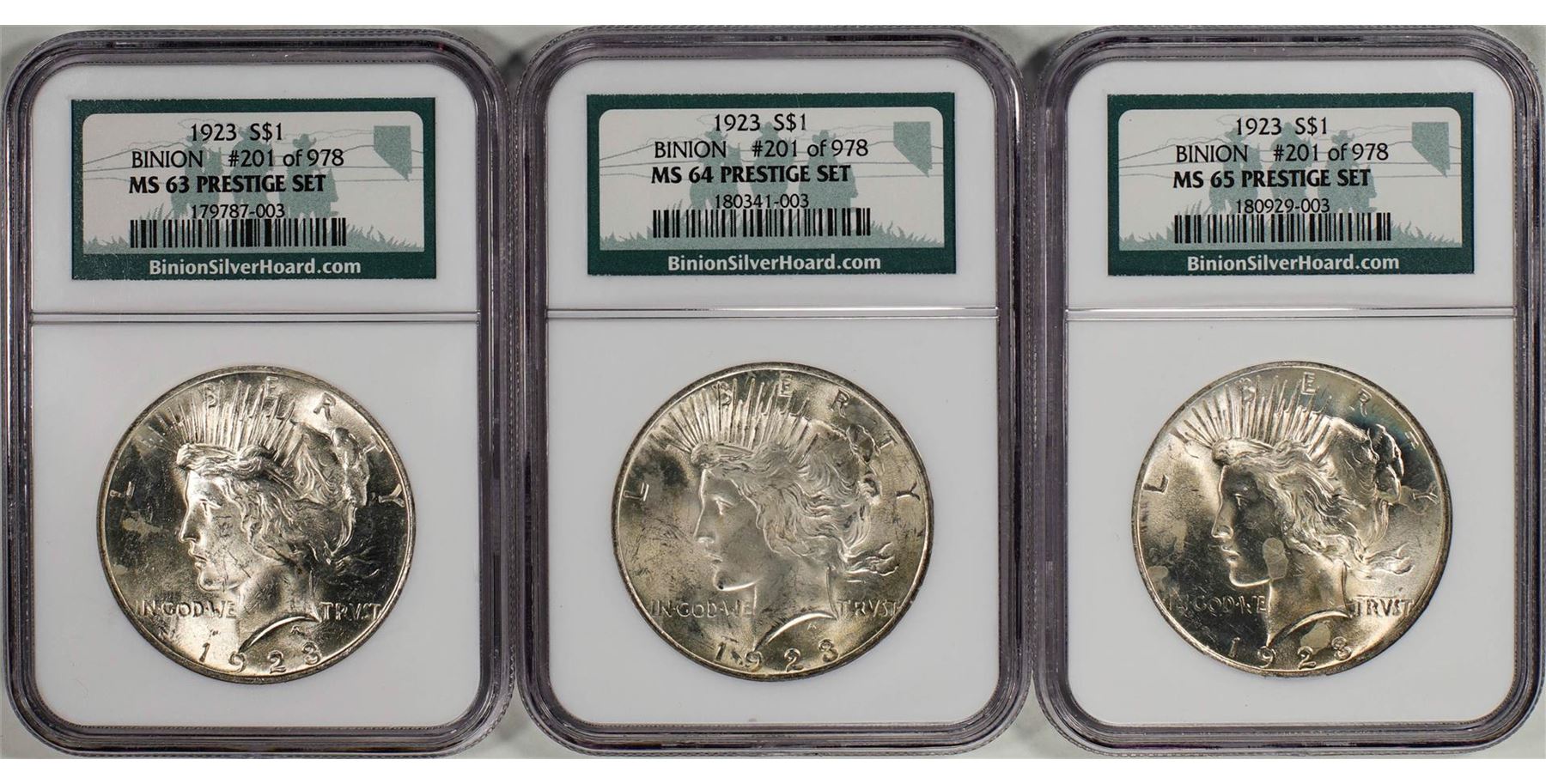 One Binion Prestige Set of (3) 1923 $1 Peace Silver Dollar Coins NGC MS63/MS64/MS65. NGC Certified.