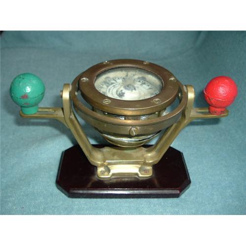This floating compass is 3" in diameter & is mounted in a heavy brass frame & fixed to a wooden stand. The compass is inscribed "Coubro & Scrutton, Ltd. London" & was acquired from a World War 2 Liberty ship that was broken down in 1968. Overall 10"W x 5"D x 6"H