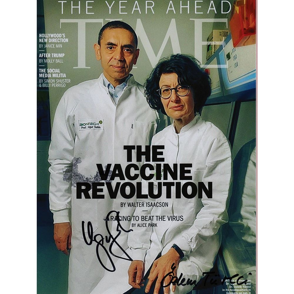 Color glossy 8 x 10 photo of a Time magazine cover featuring the BioNTech founders, signed in black felt tip by Ugur Sahin and Ozlem Tureci. In fine condition. In 2020, BioNTech famously developed the first messenger RNA-based vaccine approved for use against COVID-19.