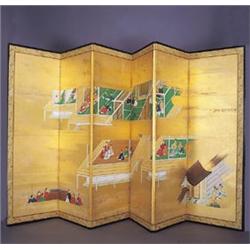 Biombo japon‚s de seis hojas, con escenas de corte. Posiblemente Ffs.S.XVII-XVIII. Medidas: 178 x 366 cms.Oro refrescado y reforrado. Salida Euros 1800 - Salida PTS 299.495