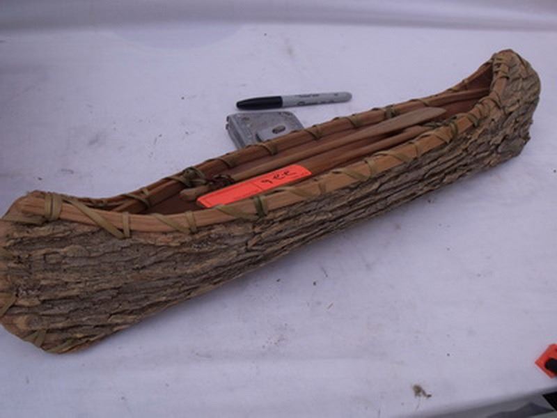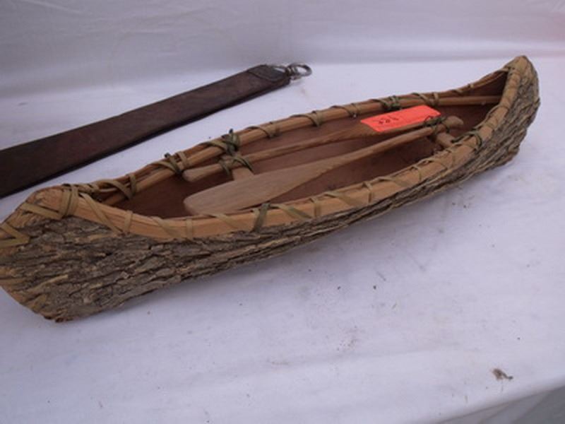 Hand made Birch bark lined canoe, c/w paddles, 22" long