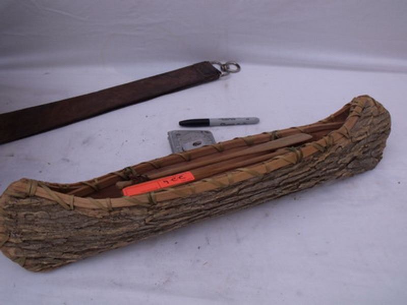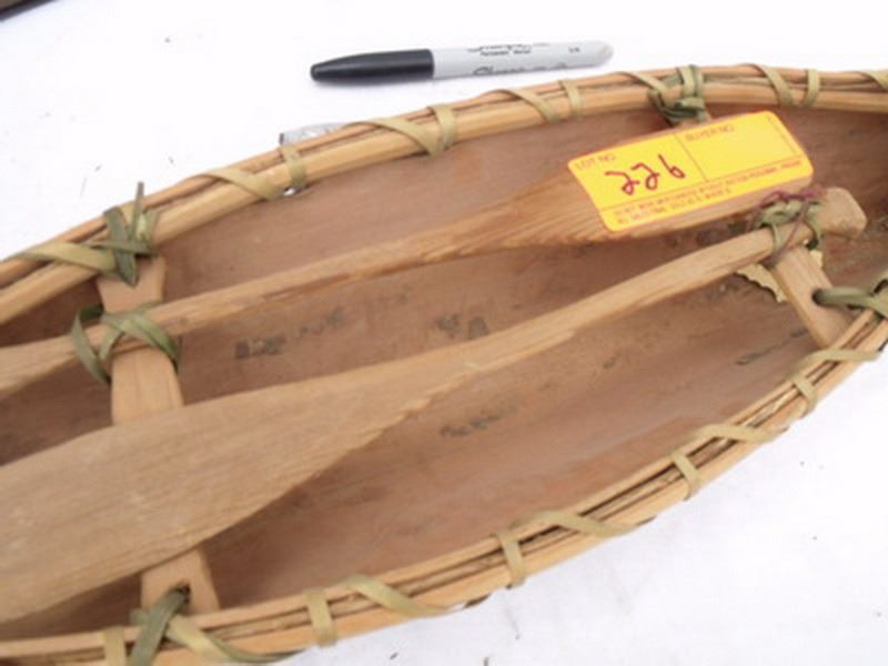 Hand made Birch bark lined canoe, c/w paddles, 22" long