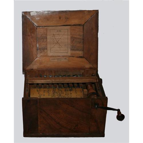 Bird Call Box. Hand-cranked box by Jerome Thibouville-Lamy Paris sometimes called a bird call box. Plain wood construction box measures approximately 10" x 8" x 6" H.