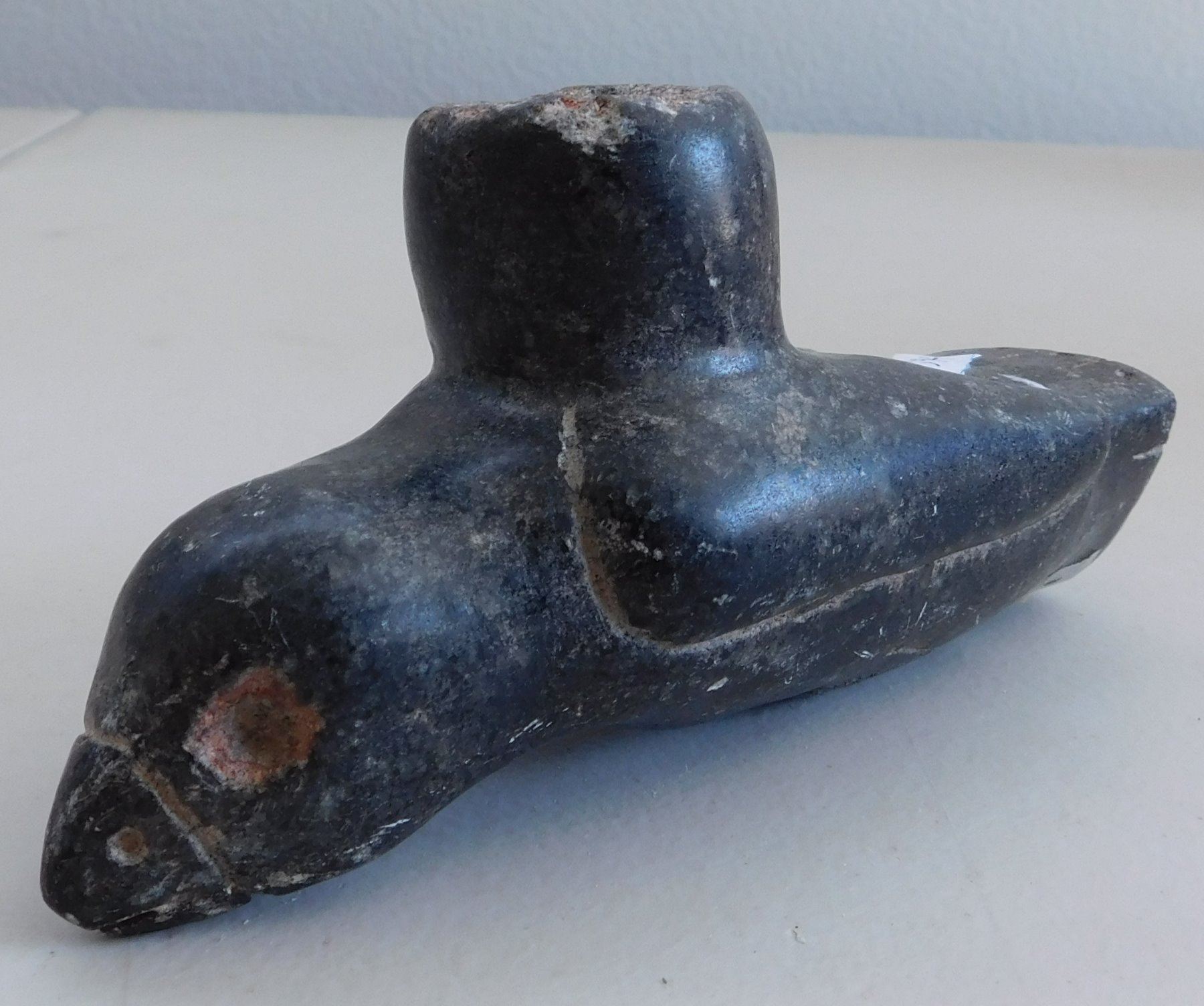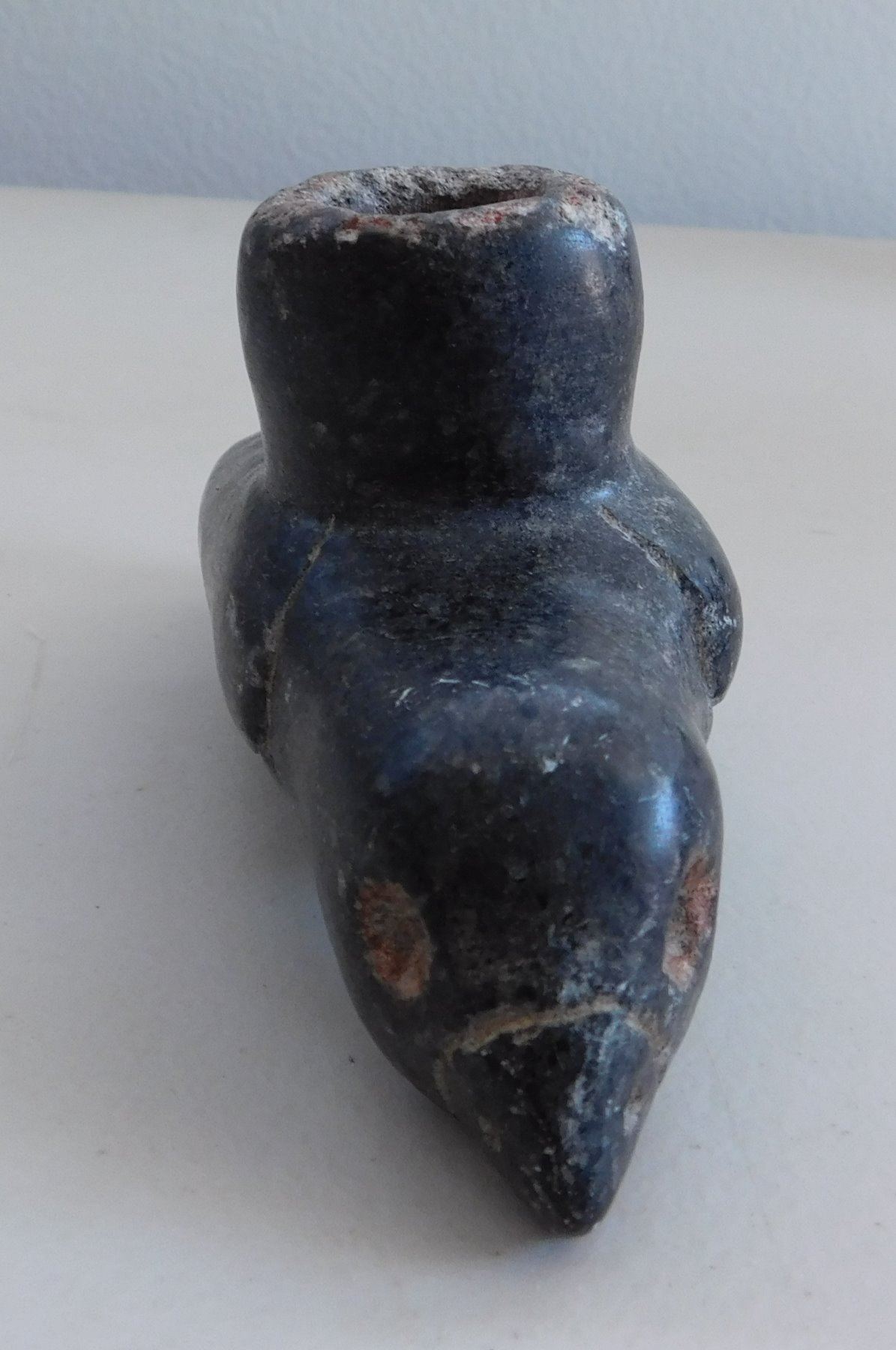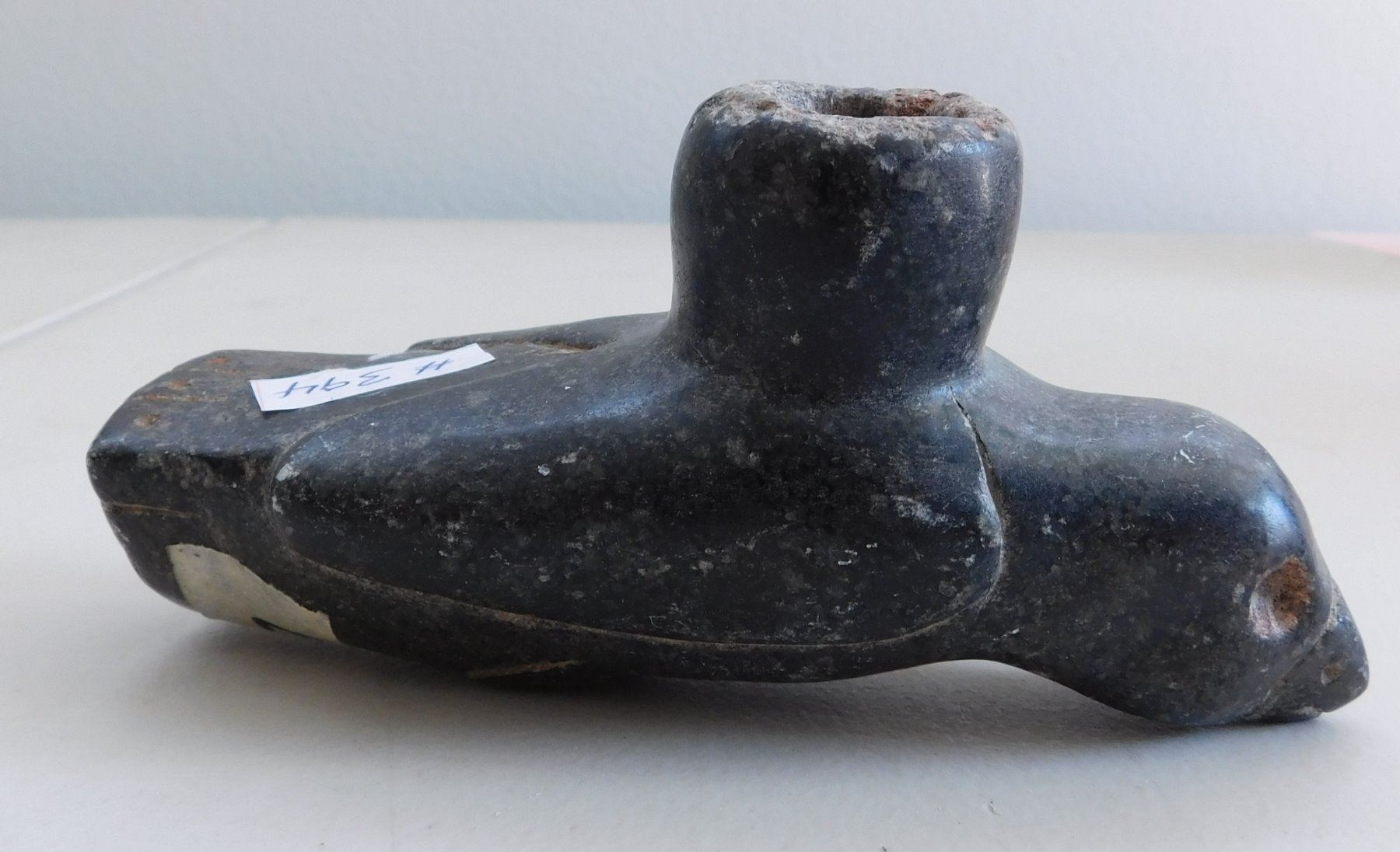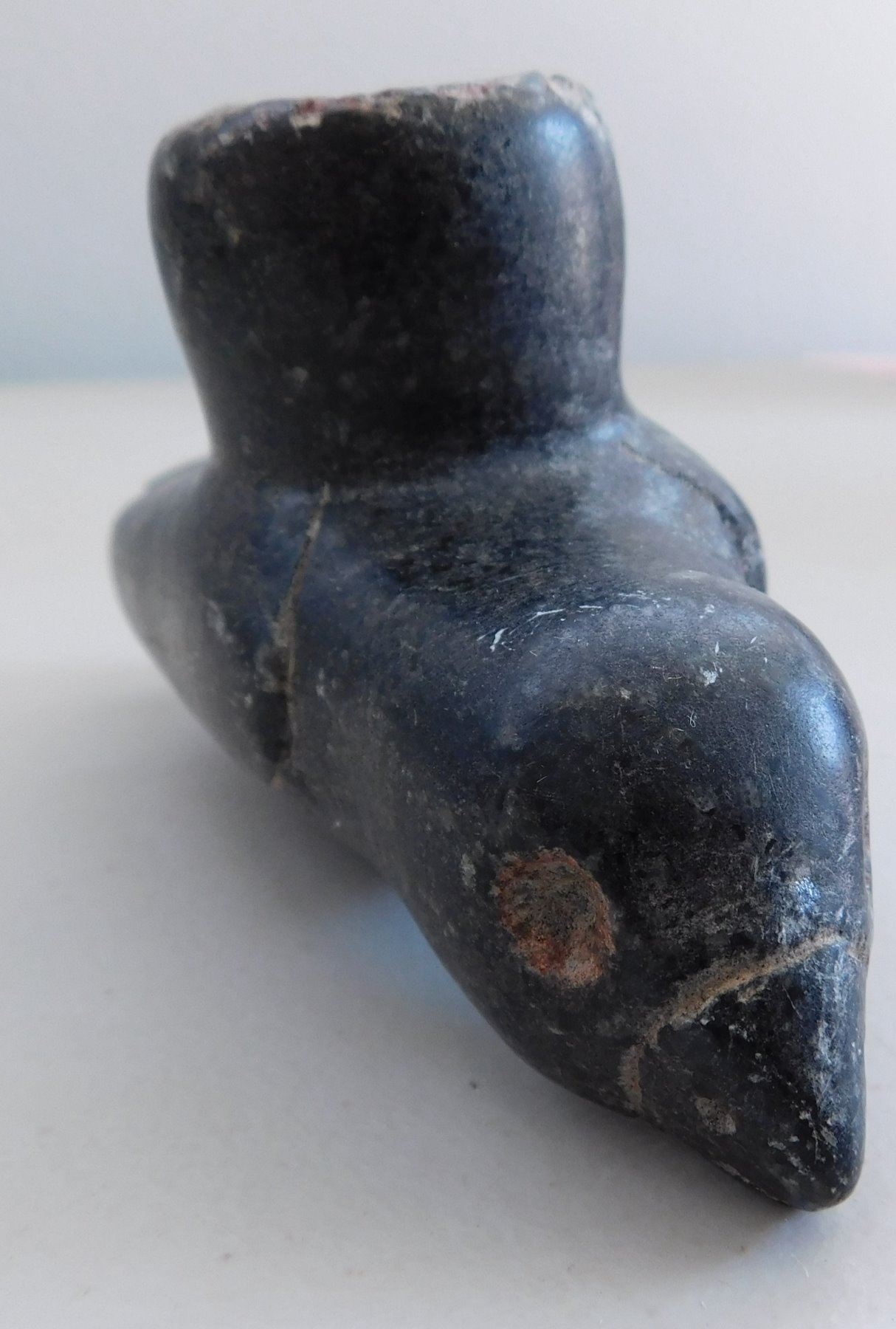 Bird Effigy Pipe, archaic period. Made of steatite, the item measures 5 1/2" x 2 1/2". Ross County, Ohio. Condition: Wear on bowl, nicks and scrapes, see images. Shipping: $22.00 w/insurance and signature.