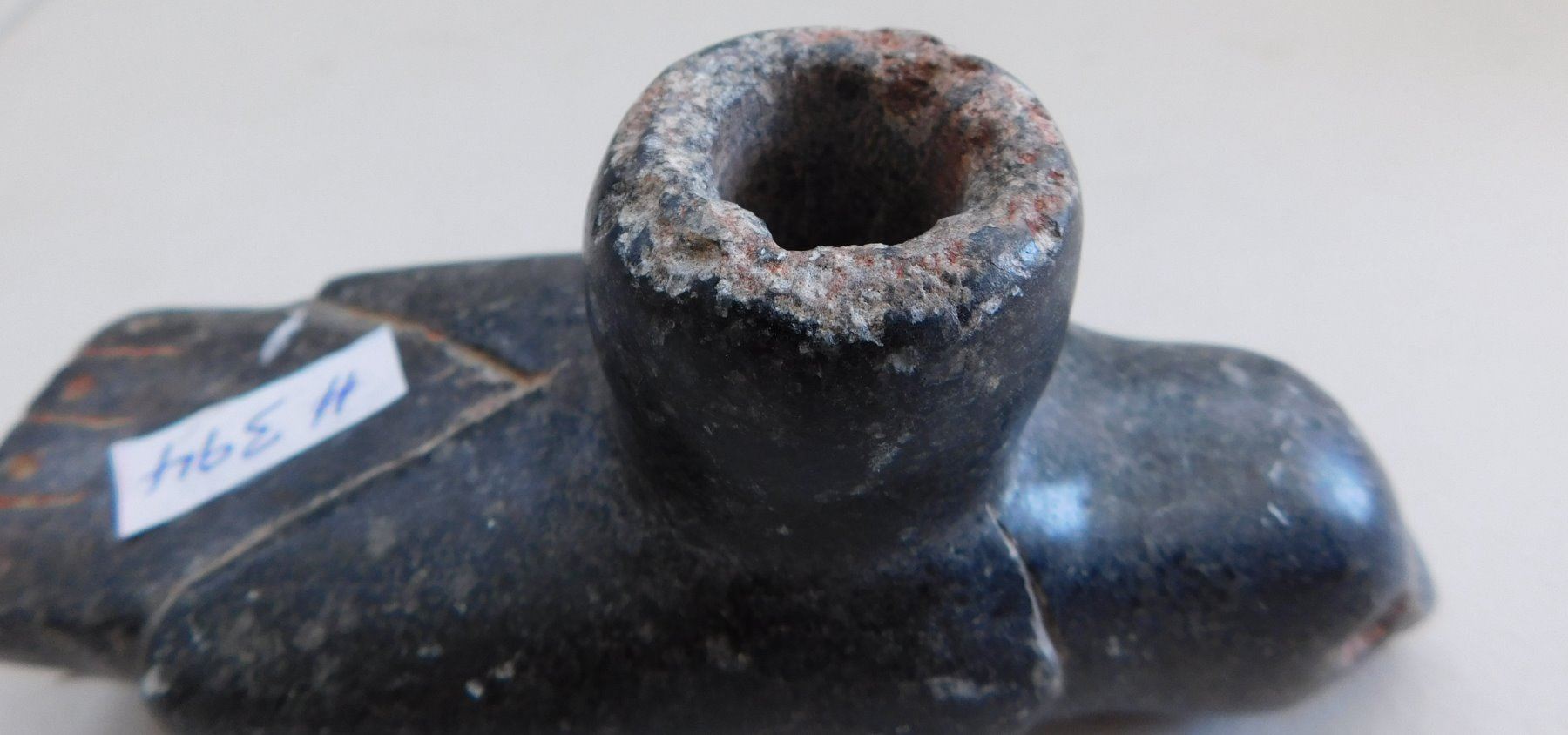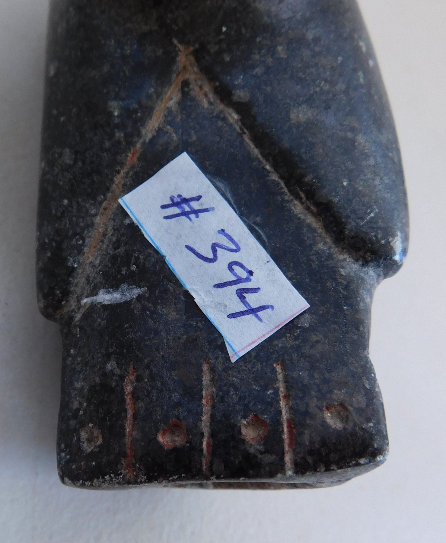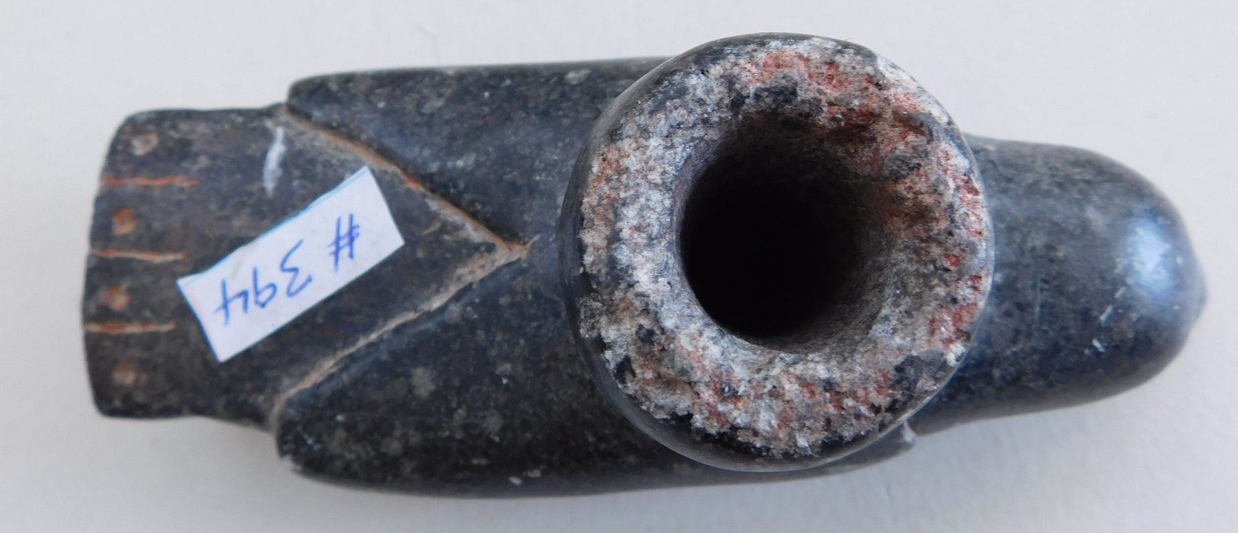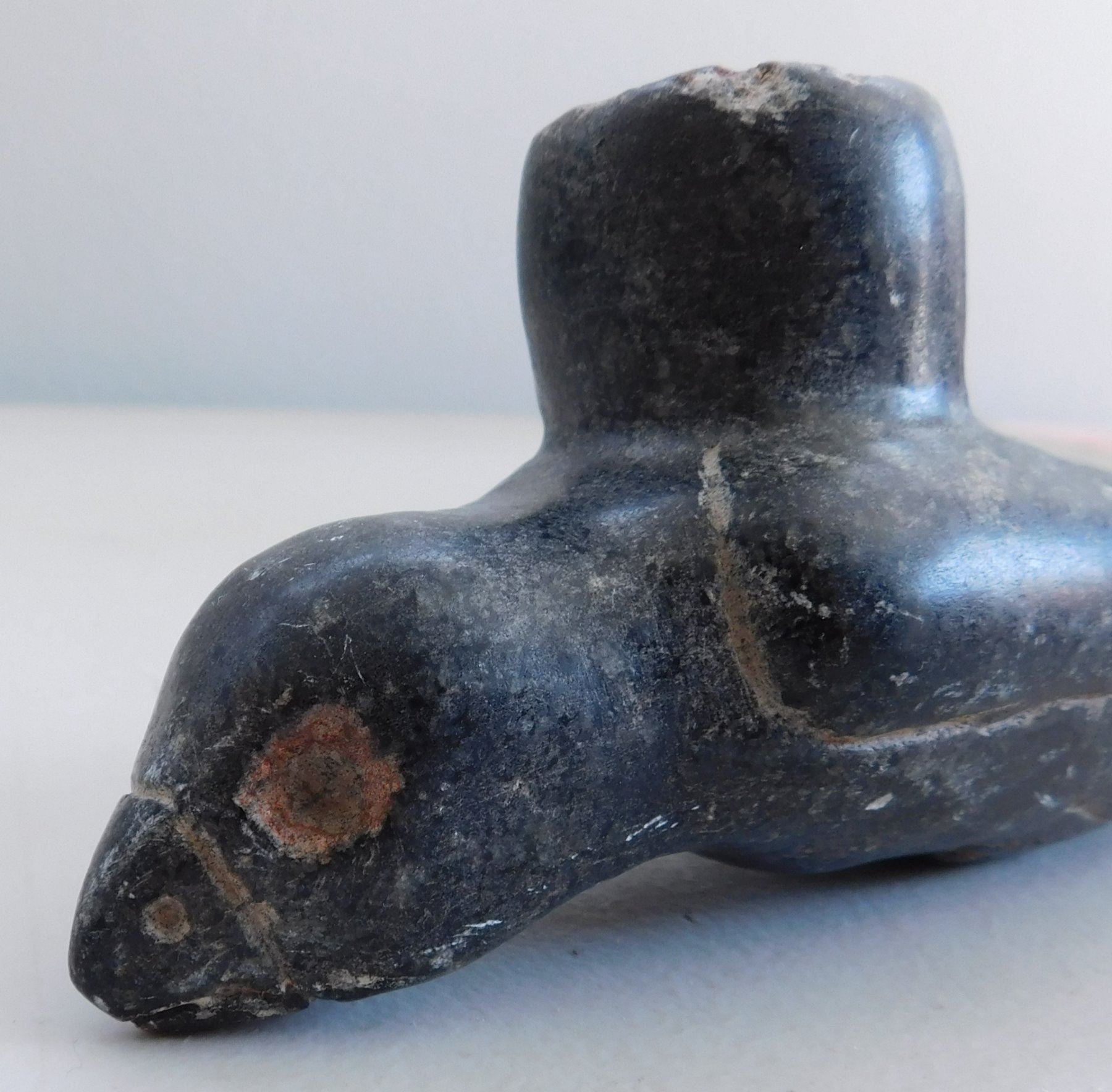 Bird Effigy Pipe, archaic period. Made of steatite, the item measures 5 1/2" x 2 1/2". Ross County, Ohio. Condition: Wear on bowl, nicks and scrapes, see images. Shipping: $22.00 w/insurance and signature.