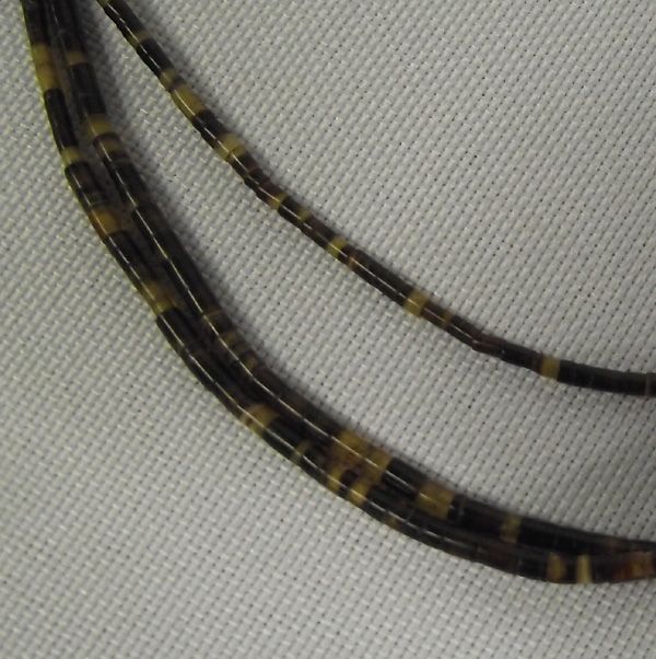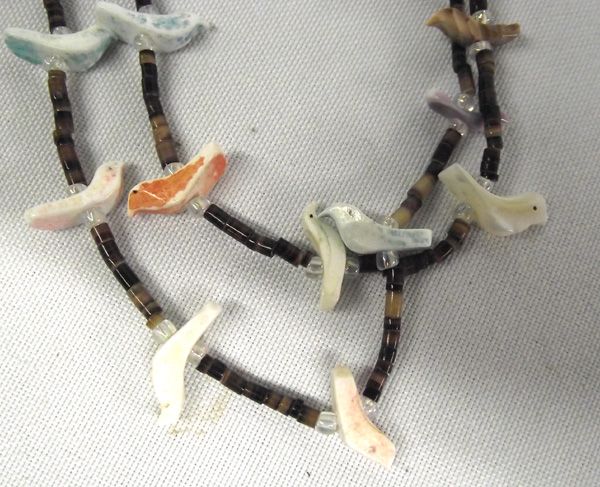 Bird Fetish and Pen Shell Heishi Necklaces. One necklace is a double strand brown shell heishi with tiny multi-colored bird fetishes, some with inlay jet eyes. The other necklace is 3 strands of tiny brown pen shell heishi. The pen shell is the longest, at 26'' end to end.