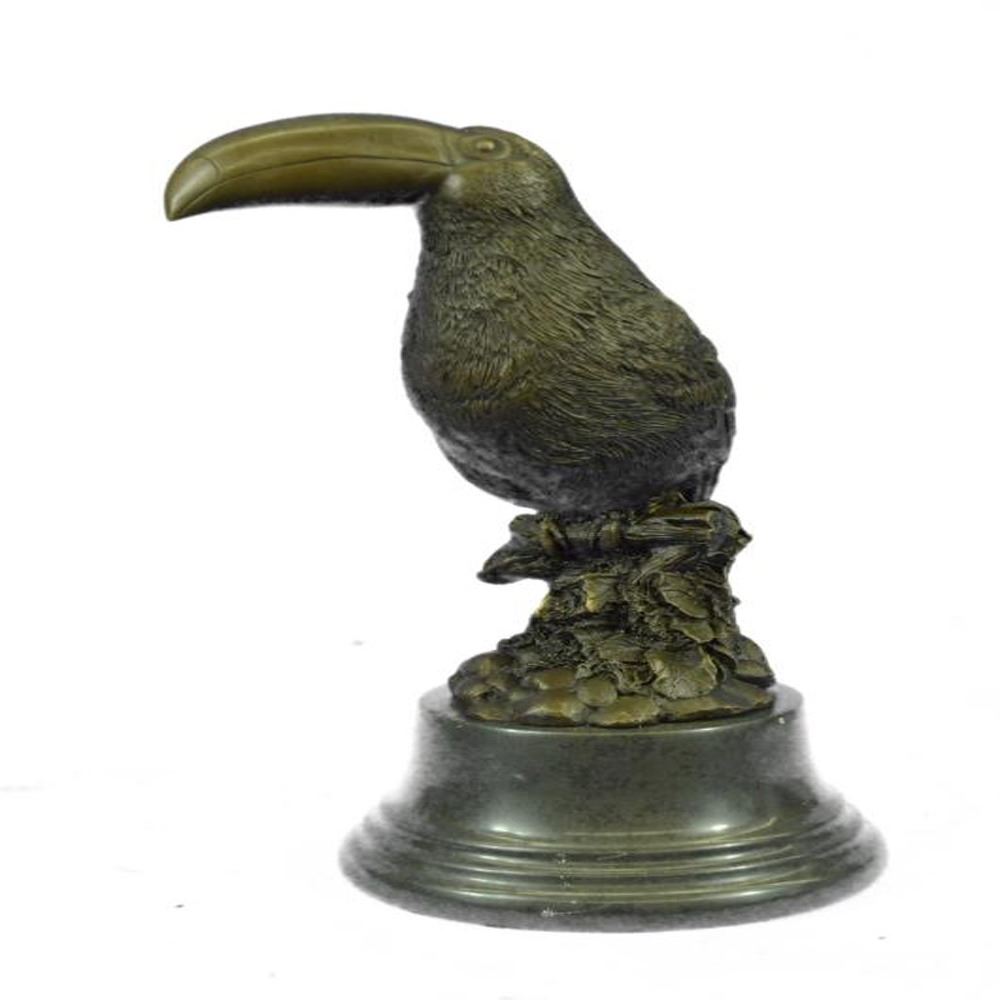 A stoic bird sits high, looking out at the land below. This would makes fine addition to any bird lover collection. With a beak shaped like the unusual Toucan, this Sculpture will bring personality to any room. This fully detailed brown patina Sculpture was cast using the Lost Wax Method. Bronze Dimensions with Marble Base: Height 10 X Width 5 inches. Weight: 8 LBS.