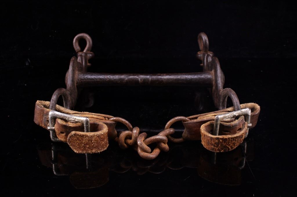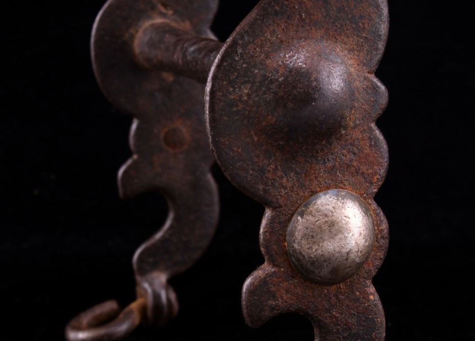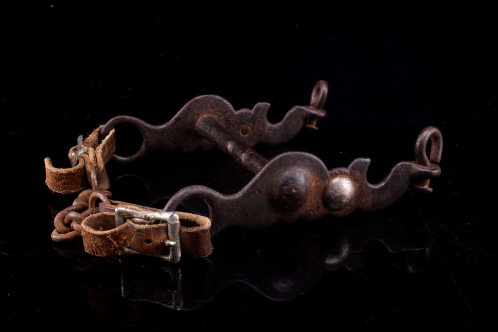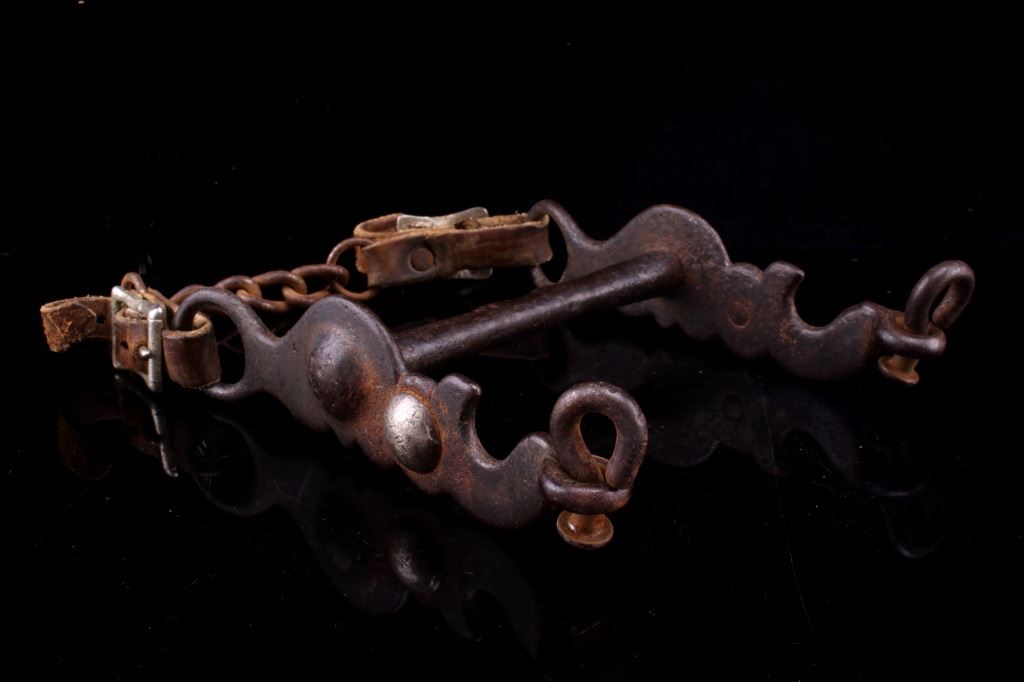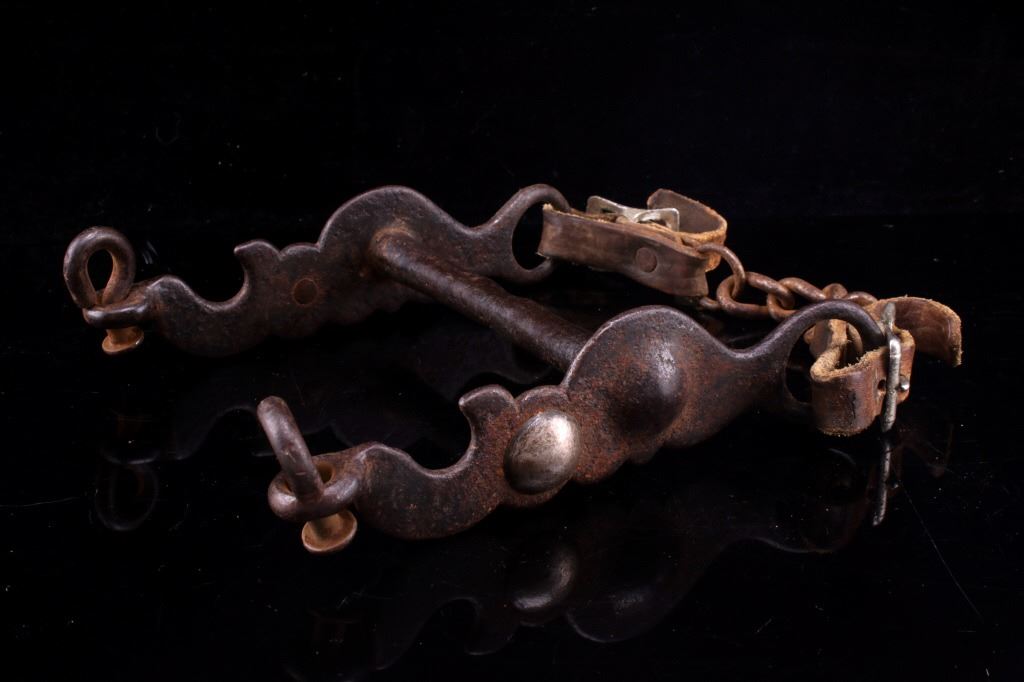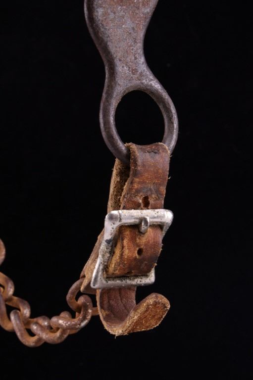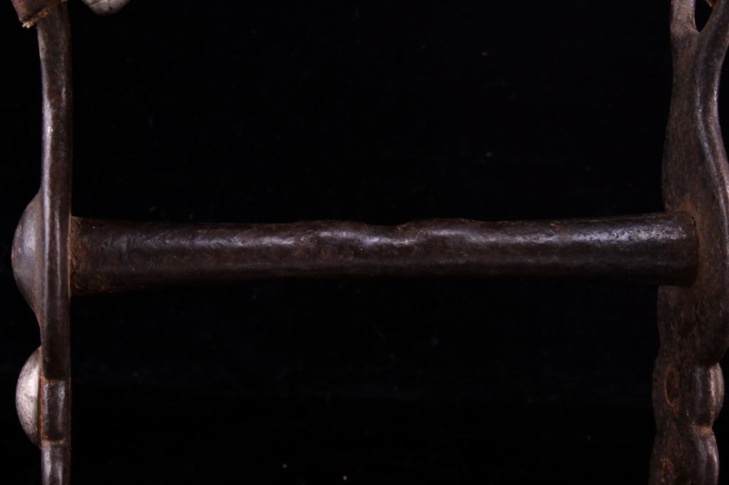 Featured in this lot is this bird head silver mounted bridle bit, circa 1930's. The bit is considered a bird head shank bridle bit with a silver mounted button on either side of the shank, a straight bar in its center, and a straight shank setting with lovely texture. The condition of this bridle bit is good, with oxidation and patina consistent with the age of the bit. The measurements of this bridle bit are 6 1/2" x 5 5/8" x 1 1/2".
