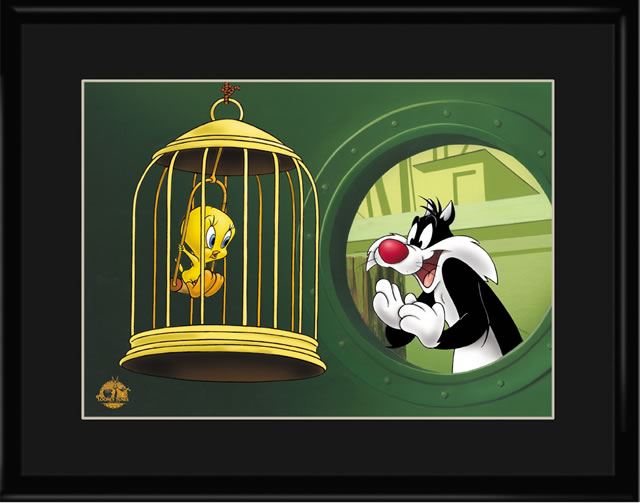 This limited edtion lithograph features Warner Bros. Looney Tunes characters, Tweety and Sylvester from the cartoon "Bird In A Guilty Cage." Size 11x14 framed, with Certificate of Authenticity. Edition Size: 5,000.