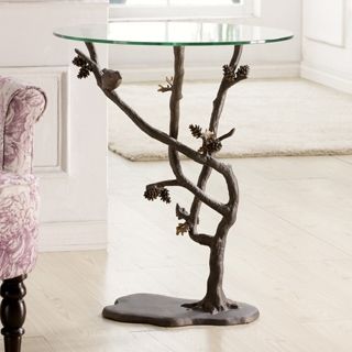 Bird & Pinecone Side Table - Glass Top - 26"H 22"W 22"D - Cast Aluminum & Glass