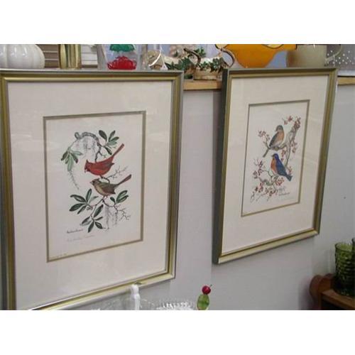Pair of framed prints, signed by world renowned South Carolina artist, Anne Worsham Richardson. First is entitled "Cardinal With Live Oak" and the second is "Bluebirds". Ms. Richardson is the official artist for South Carolina's bird and state flower. Her work has been exhibited all over the world. These two prints are in excellent condition in their original frames. Framed size is approximately 24" x 30"
