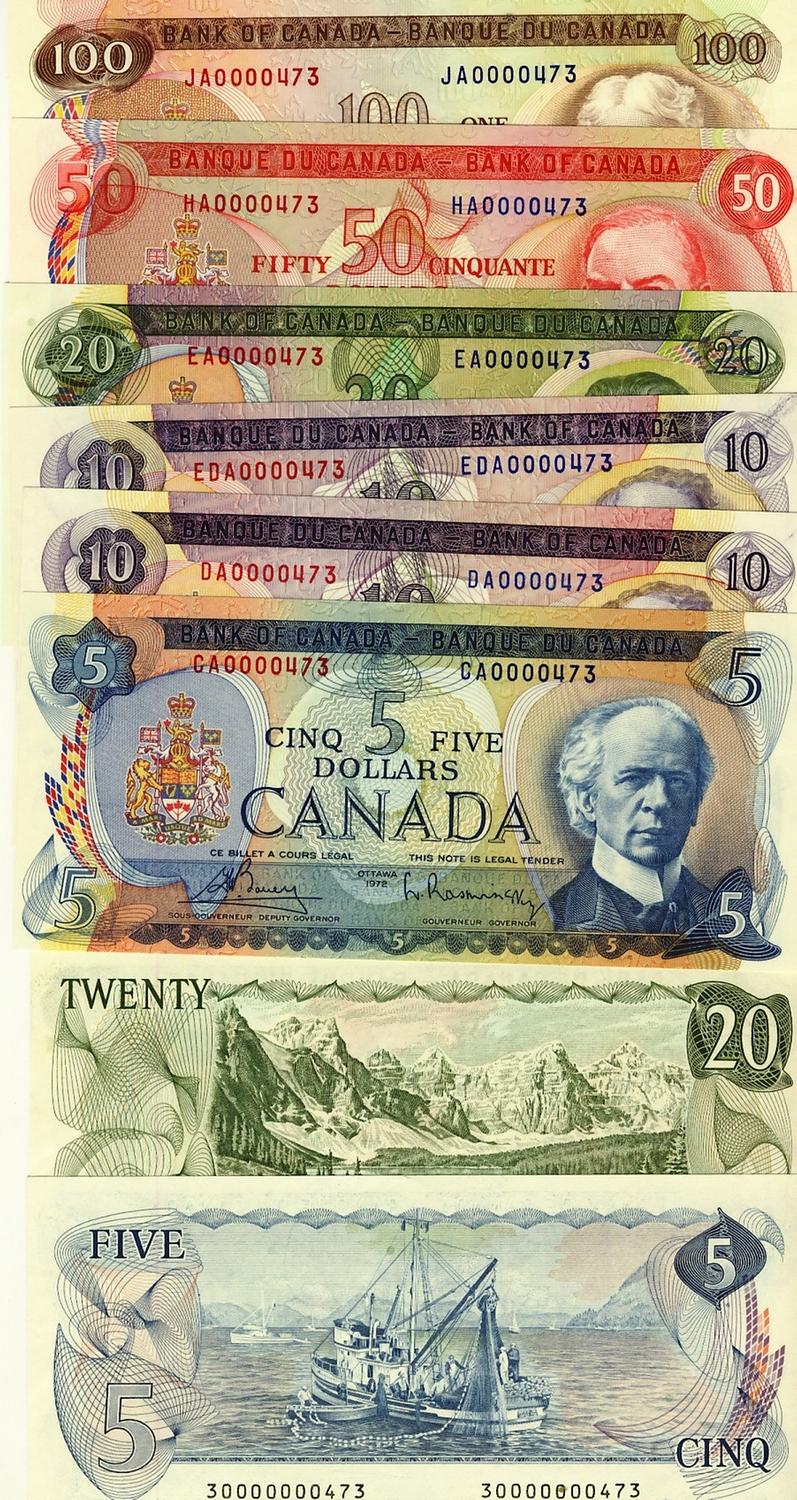 Bird Series Low Serial Matched Number set #473. Includes 1972 & 1979 $5, 1971 $10(2), 1969 & 1979 $20 along with 1975 $50 & 1979 $100. As sold by the Bank of Canada, AU to UNC. 8 notes.