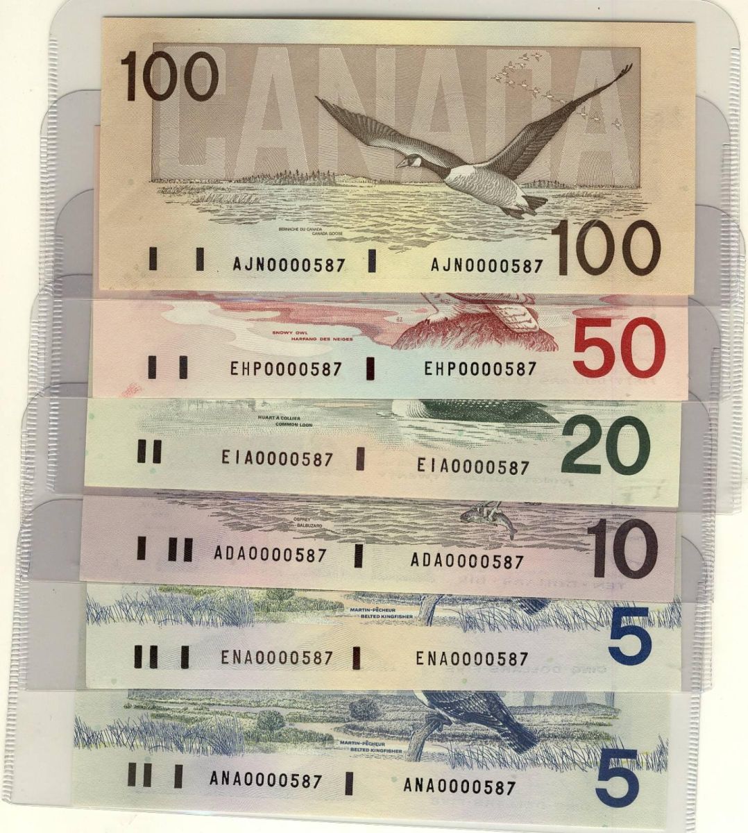 Bird Series Match Low Serial Number Set #0000587. Includes 1986(2) $5, 1989 $10, 1991 $20, 1988 $50 and 1988 $100. 6 notes. UNC