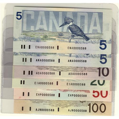 Bird Series Match Low Serial Number Set #0000588. Includes 1986(2) $5, 1989 $10, 1991 $20, 1988 $50 and 1988 $100. 6 notes. UNC