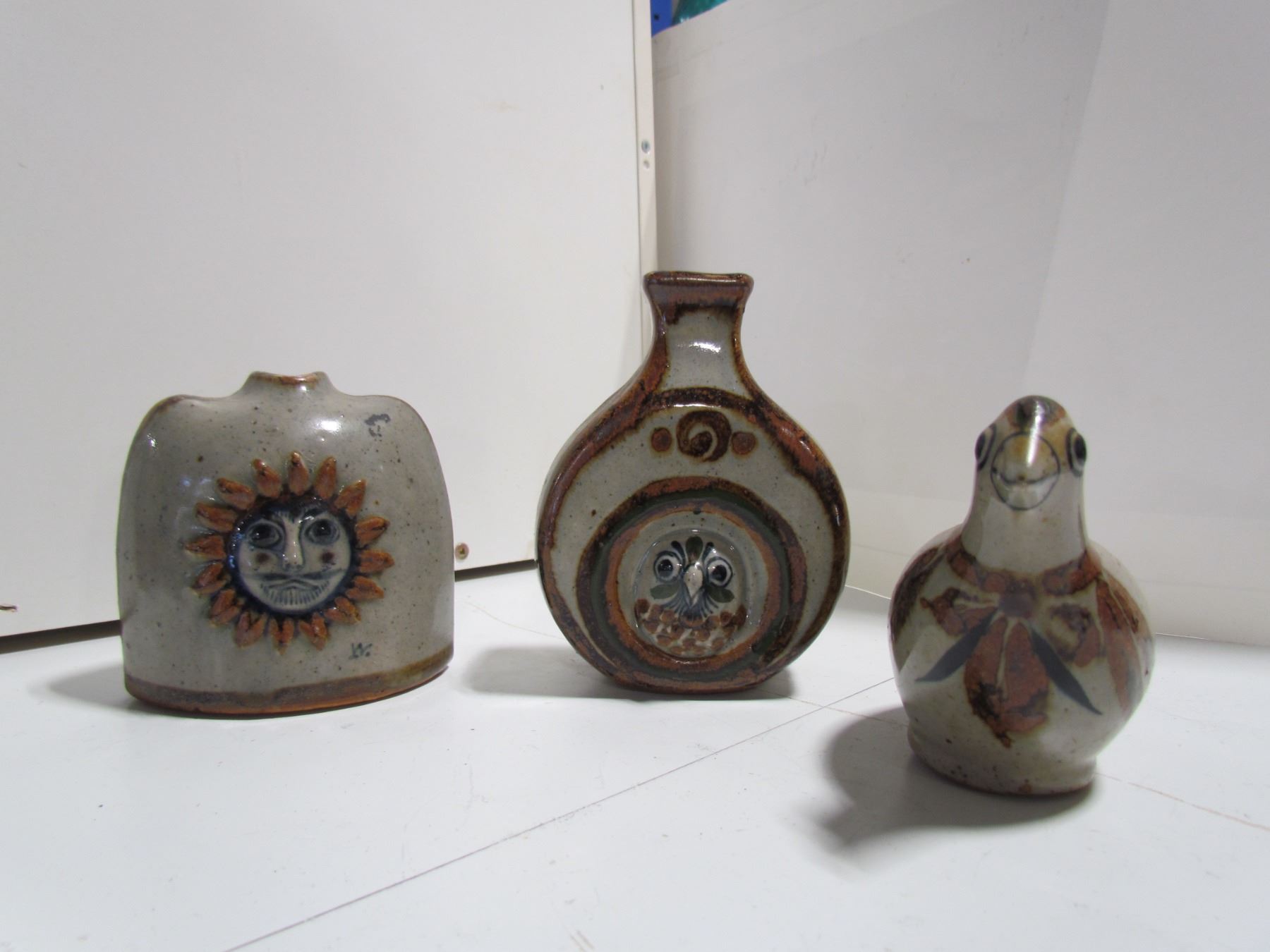 Matching 3 piece set of a Bird and two vases, rustic and blue in colour.