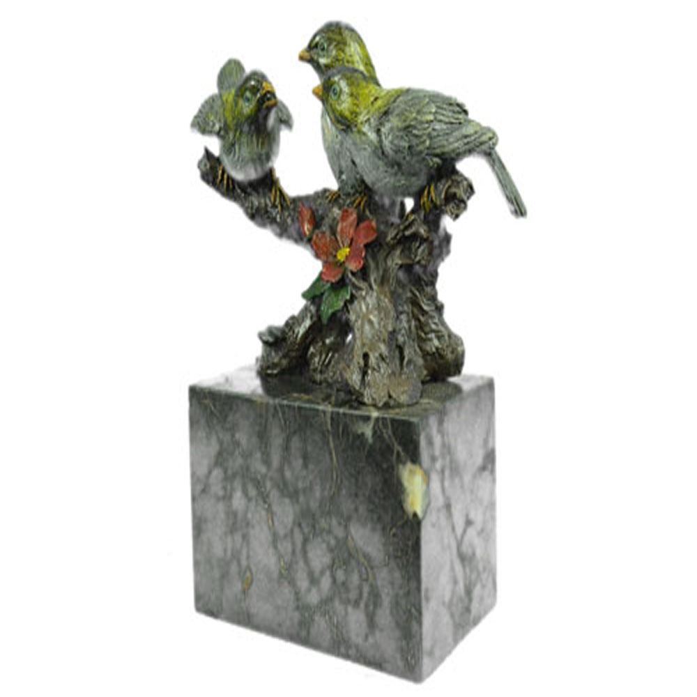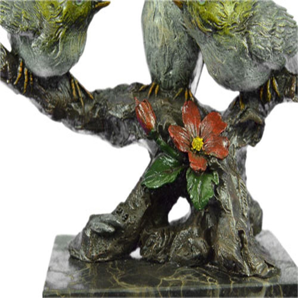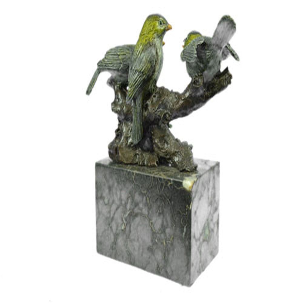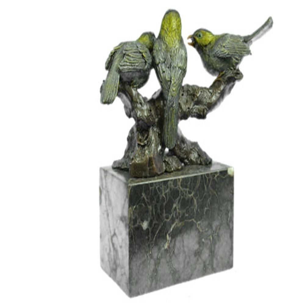 Birds of paradise. Perched on a brown marble base, the breathtaking multi color Finches figurines are a testament to natures beauty, featuring wings of vibrantly colored real Bronze. It is a great gift for nature lovers, fisherman, hunters and country dwellers. It may even be a sweet gesture to a lovely devoted couple on their golden anniversary. This brown patina Sculpture was cast using the Lost Wax Method and mounted on a marble base. Bronze Dimensions with Marble Base: Height 8 X Width 8 inches. Weight: 9 LBS.