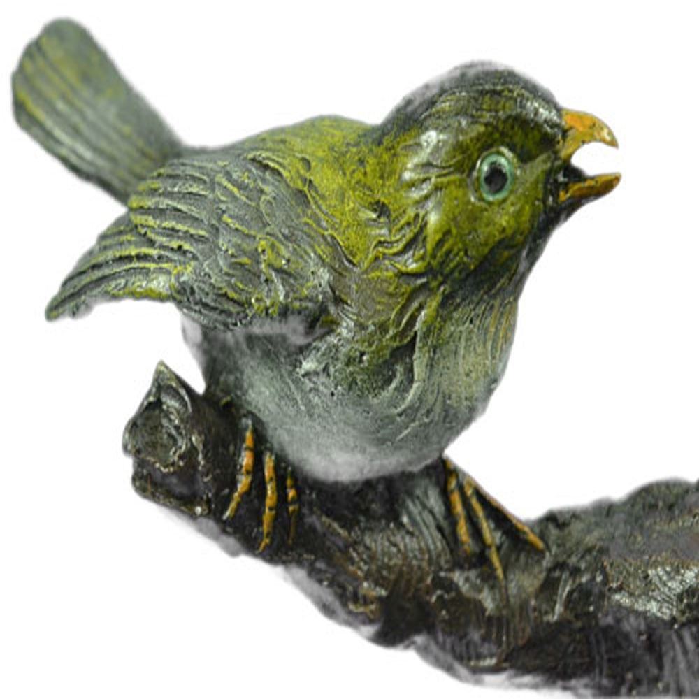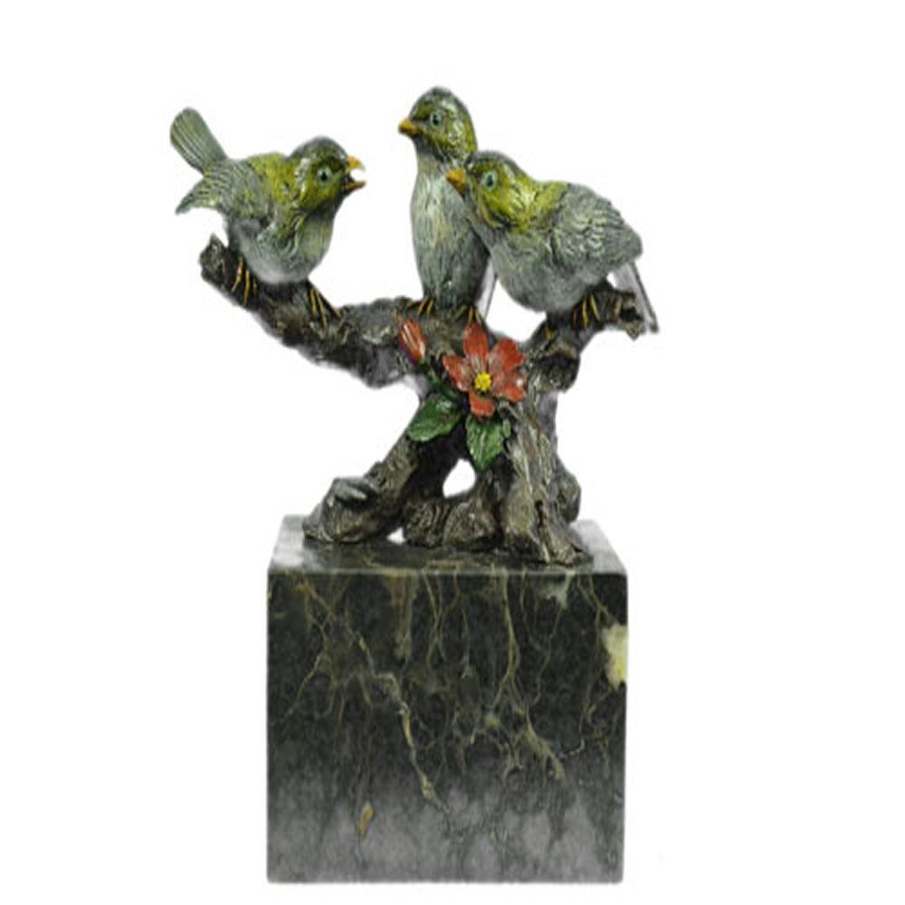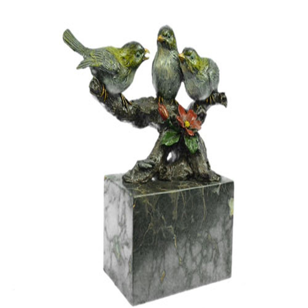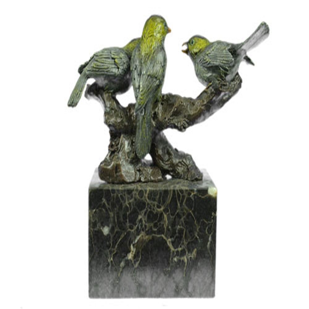 Birds of paradise. Perched on a brown marble base, the breathtaking multi color Finches figurines are a testament to natures beauty, featuring wings of vibrantly colored real Bronze. It is a great gift for nature lovers, fisherman, hunters and country dwellers. It may even be a sweet gesture to a lovely devoted couple on their golden anniversary. This brown patina Sculpture was cast using the Lost Wax Method and mounted on a marble base. Bronze Dimensions with Marble Base: Height 8 X Width 8 inches. Weight: 9 LBS.