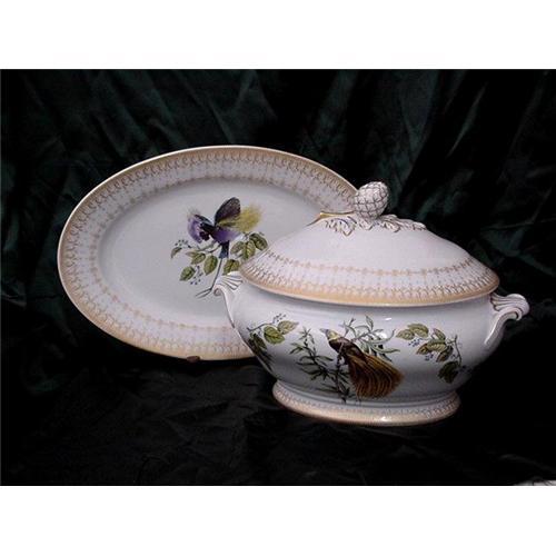 Bird of Paradise Tureen with under plate. Large covered tureen with Oak Leaf and egg corn finial, 14" long x 10 1/2"tall x 9" wide, has transfer decoration of "Lesser and Greater Birds of Paradise. 15 3/4" x 10 3/8" Under plate Pictures the Blue Bird Of Paradise. Made in Portugal, A Mottahedeh design.