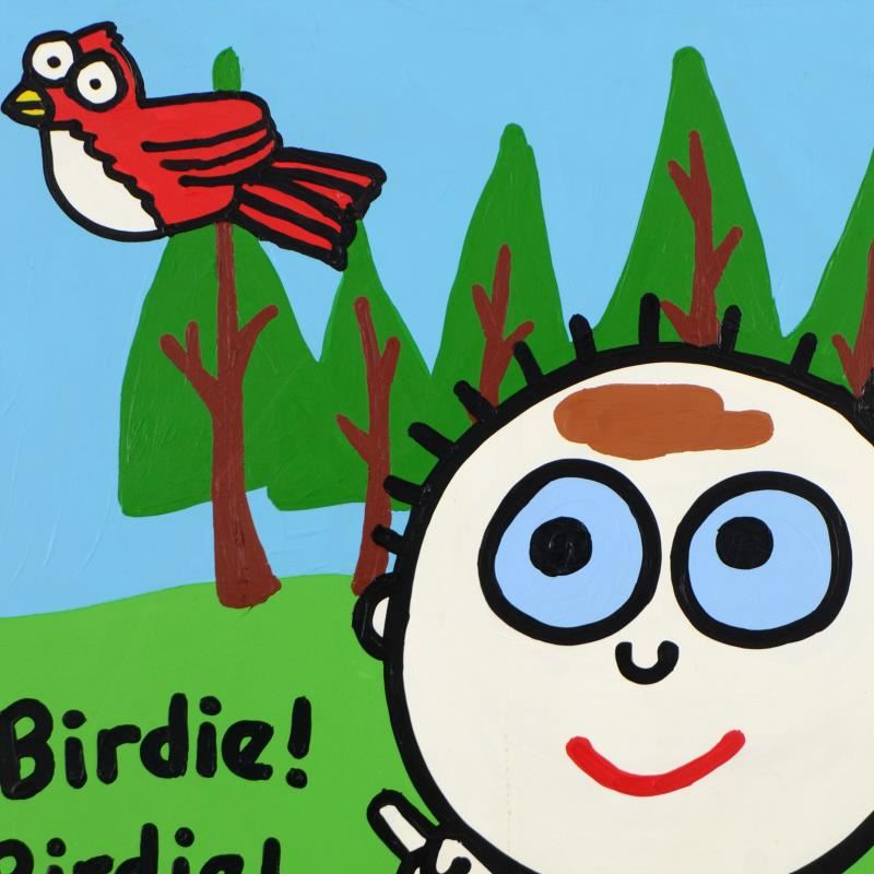 "Birdie!" is an original acrylic painting on canvas by Todd Goldman, hand signed by the artist. This piece comes gallery wrapped. Includes Certificate of Authenticity. Measures approx. 36" x 36" (image). There is minor wear on the corners and edges of this piece.