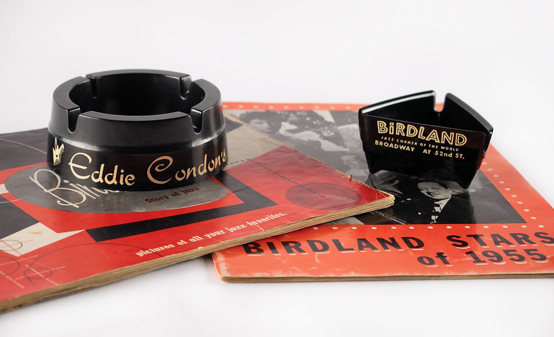 Two original ashtrays: one marked "Birdland, Jazz Corner of the World, Broadway at 52nd Street," and the other marked "Eddie Condon's." The Birdland ashtray, in particular, is a rare and remarkable piece of historic jazz ephemera. Also includes two programs from the Birdland Jazz Club—one entitled "The Birdland Story of Jazz" and the other entitled "Birdland Stars of 1955"—depicting the likes of Billie Holiday, Dizzy Gillespie, Duke Ellington, Dave Brubeck, Sonny Stitt, Sarah Vaughan, Oscar Peterson, Ella Fitzgerald, Erroll Garner, and Thelonious Monk inside. In overall very good to fine condition, with cover and handling wear to the programs (and old clear tape to one of the spines).