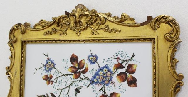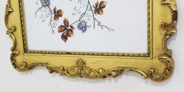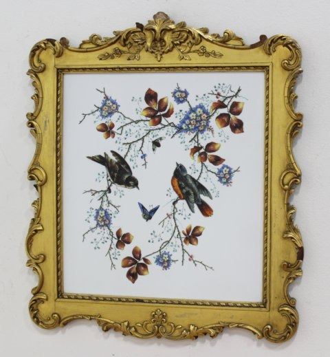 Enamel on milk glass. Approx. 21 1/2" H x 19 1/2" W sight, 31" H x 26" W framed. From an Edgewater, NJ estate. Damages to top of frame.