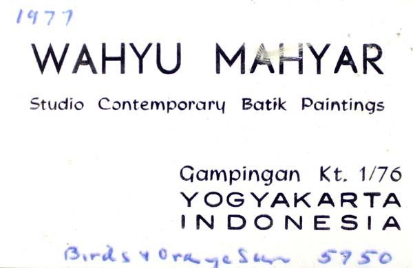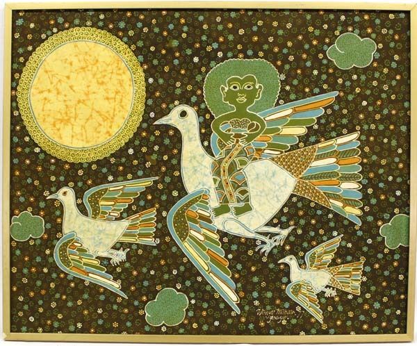 1977 Birds & Orange Sun Batik Painting by Wahyu Mahyar, measures 21'' x 17'', framed and ready to hang, beautiful colors