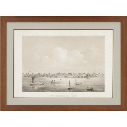 <B>Helmut Holtz - Birds-eye View of Matagorda</B></I> Taken from the Bay on the Royal Yard, on board the <I>Barque Texana,</B></I> Sept. 1860. Hamburg: Ed Lang's Lithographical Establishment, 1860. 35.9 x 53.1 cm. Some moderate foxing in margin. Image very good. Handsome framing. Since Holtz was the artist and publisher of the Indianola and Matagorda views, they are very similar in style. Reps <I>Views and Viewmakers 3986.</B></I> Reps locating only two copies of this view. None in Texas. <I>Courtesy of Denwood & Dana Butler, Mason.</B></I> Consigned Lot <BR><BR><b>This 2006 March Texas State Historical Association Charity Auction is being held in Austin, TX on February 12 - March 4, 2006. This is a charity auction. All proceeds from donated lots in the auction, commissions from consigned lots, and the buyer's premium go solely to the Texas State Historical Association. The floor auction session is by invitation only. Online bidding ends March 3, 2006 at 10:00PM CT. Your secret maximum bid will compete for you during the floor auction, and it is possible that you may be outbid on the floor after internet bidding closes. The applicable buyer's premium for this auction is an amount equal to 15% (minimum $9 per lot) of the successful bid on ebay. State law requires lots consigned (not donated) to THSA collect full sales tax on items that sell for a total of $5,000 or more. </b>
