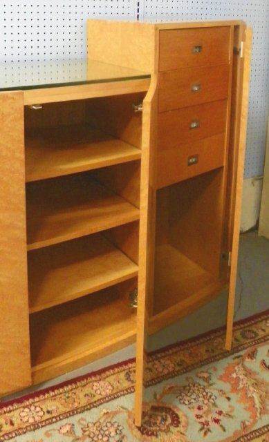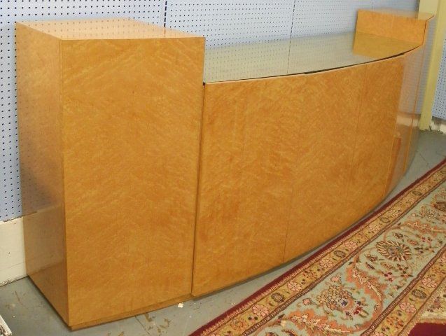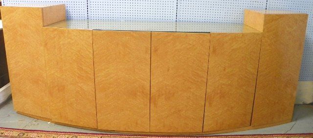 Drop down center glass top. Curved front, 6 doors, full interior, shelves & drawers, one side fitted with 4 felt lined sectioned drawers. Center approx. 72" x 36.5" x 108", side section 8' x 42.5" x 24" D. Please read our terms of sale.