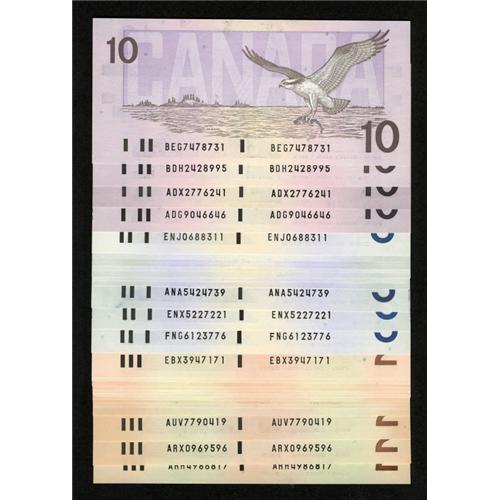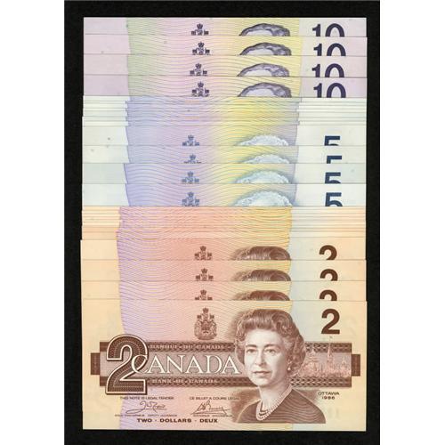 <B>Birds of Canada Notes - $2s 1986; $5s 1986; and $10s 1989 Choice Crisp Uncirculated</B></I><BR> This lot has the following - $2 BC-55a; 55aA; 55b; 55bA (4); 55b-i; 55bA-i; 55c; 55cA; 55c-i; 55cA-i; $5 BC-56a; 56b; 56bA; 56c; 56c-i; 56cA-i; 56d; 56e; 56eA; 56e-i (2); $10 BC-57a; 57aA; 57b; and 57c.<BR><I>From The Thomas M. Flynn Collection</B></I><BR><BR><b>Shipping:</b> Coins & Currency (<a target="_blank" href="http://www.heritageauctions.com/common/shipping.php">view shipping information</a>)