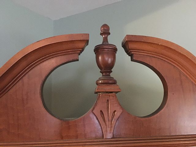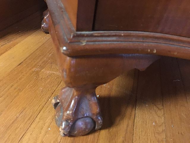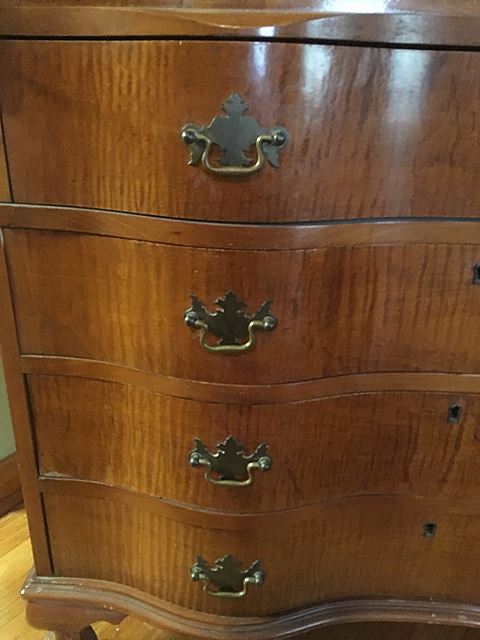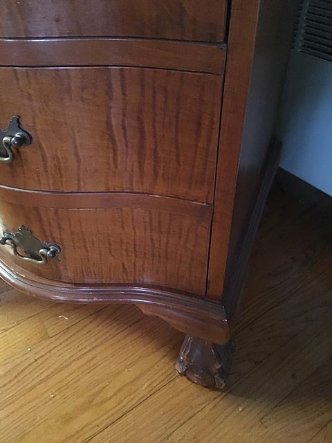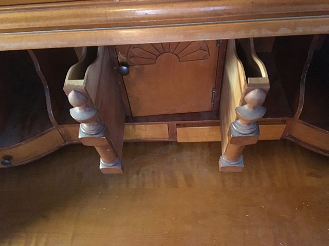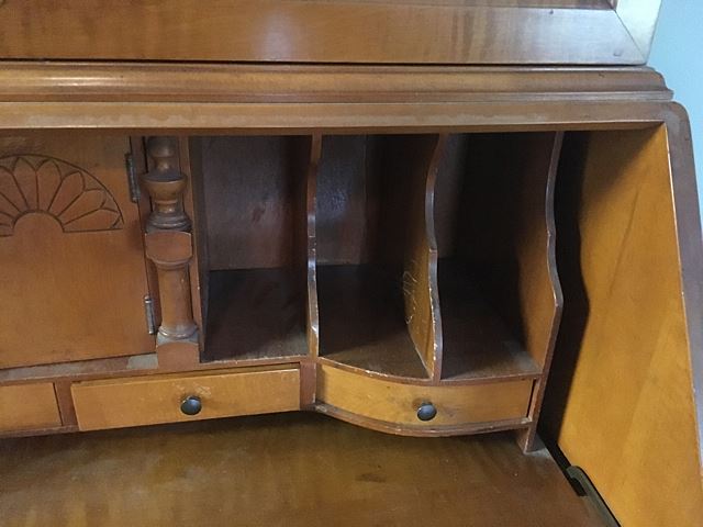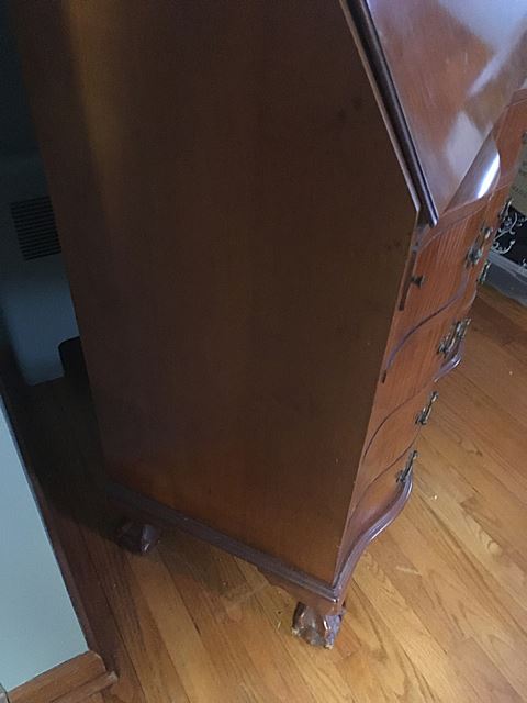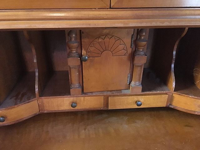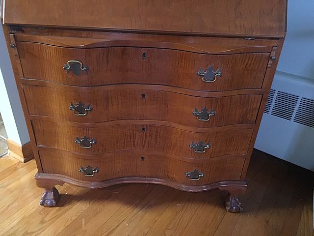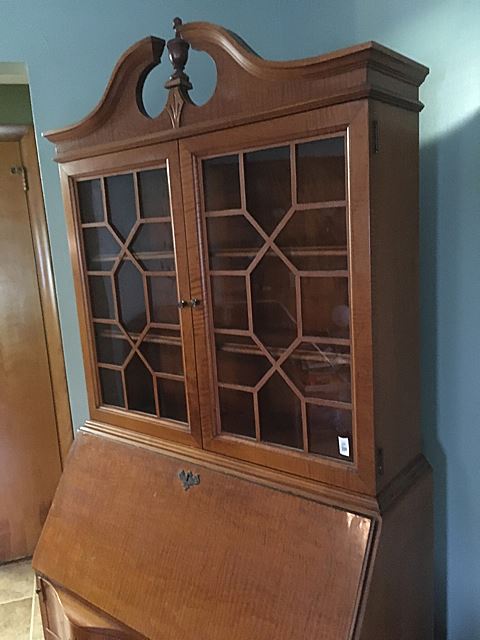 Birdseye Maple Writing Desk, bow front with 2 glass doors, 4 claw feet, 2 secret compartments, with original key. Measures approx. 34" wide x 78" tall x 16 1/2" deep