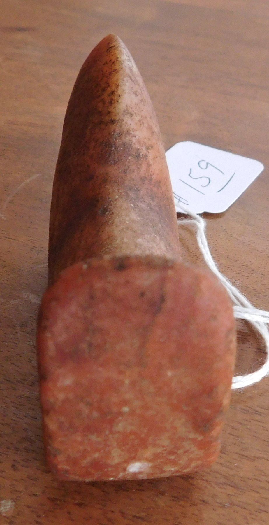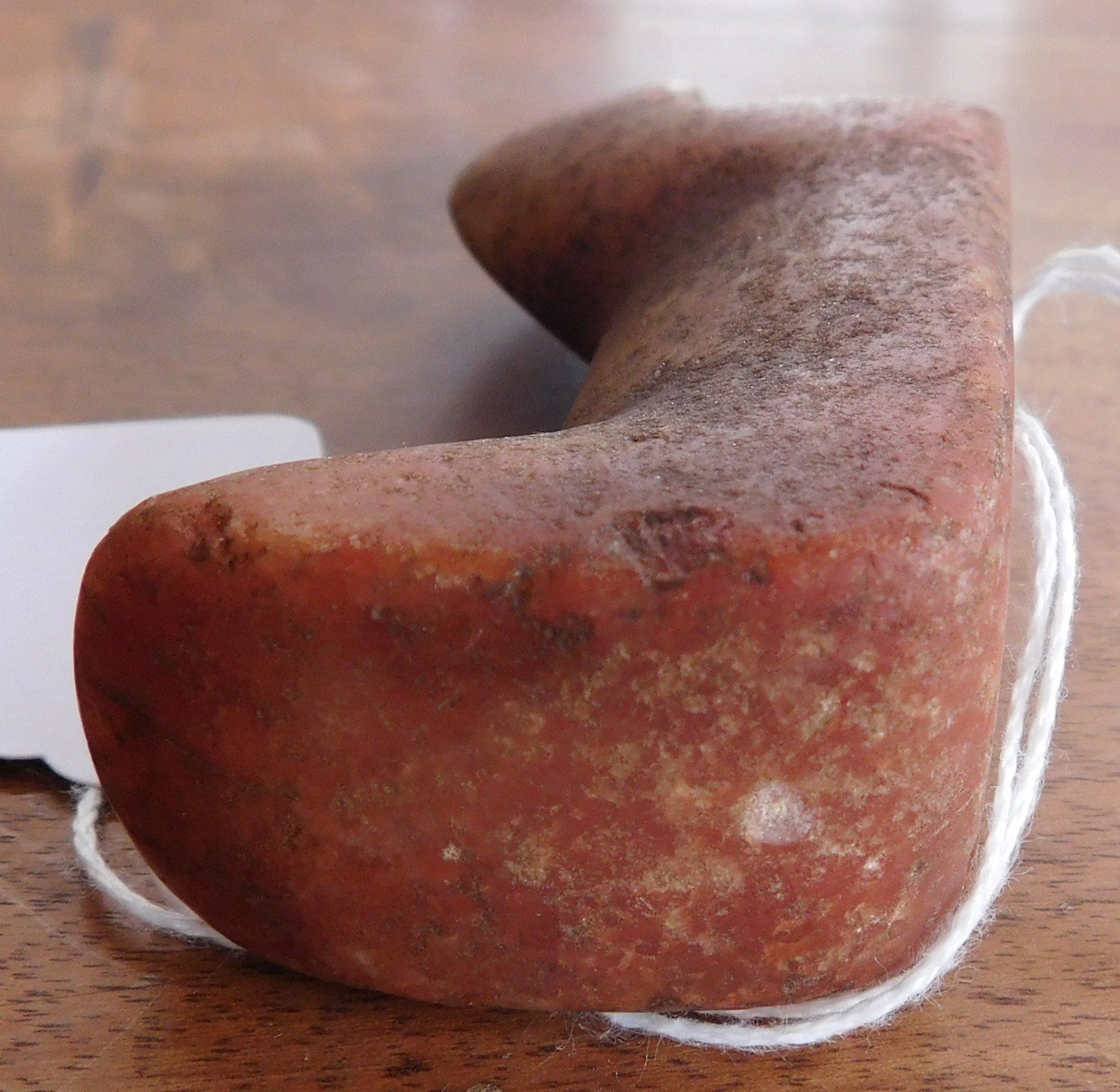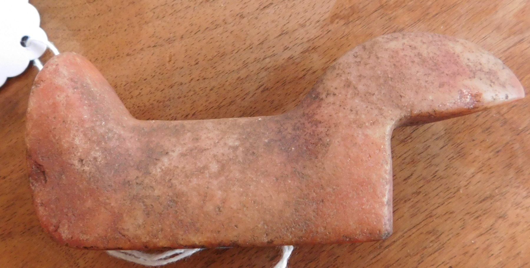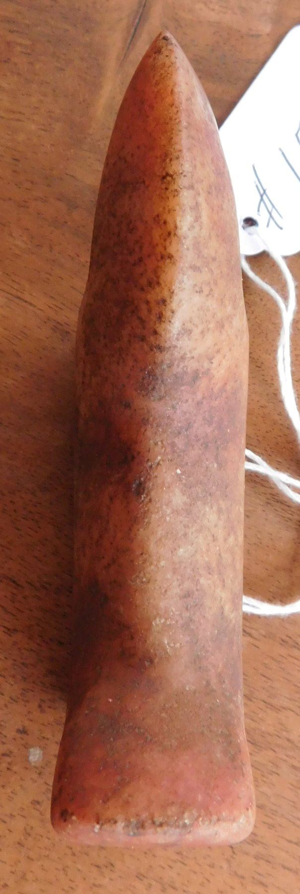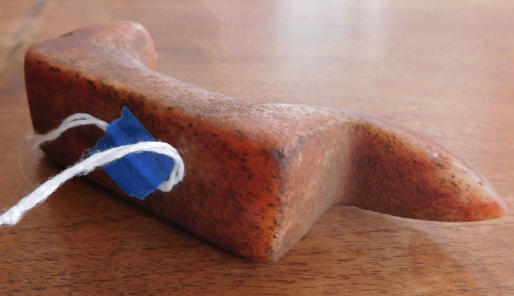 Birdstone, pre-historic item. Made of ferruginous quartz, the item measures 4 1/4" x 1 1/16" x 1 5/8". Undrilled, unfinished. Morgan County, Illinois. From an old, 1960s California collection. Condition: As found, good patina, see images. Shipping: $16.50 w/insurance and signature.