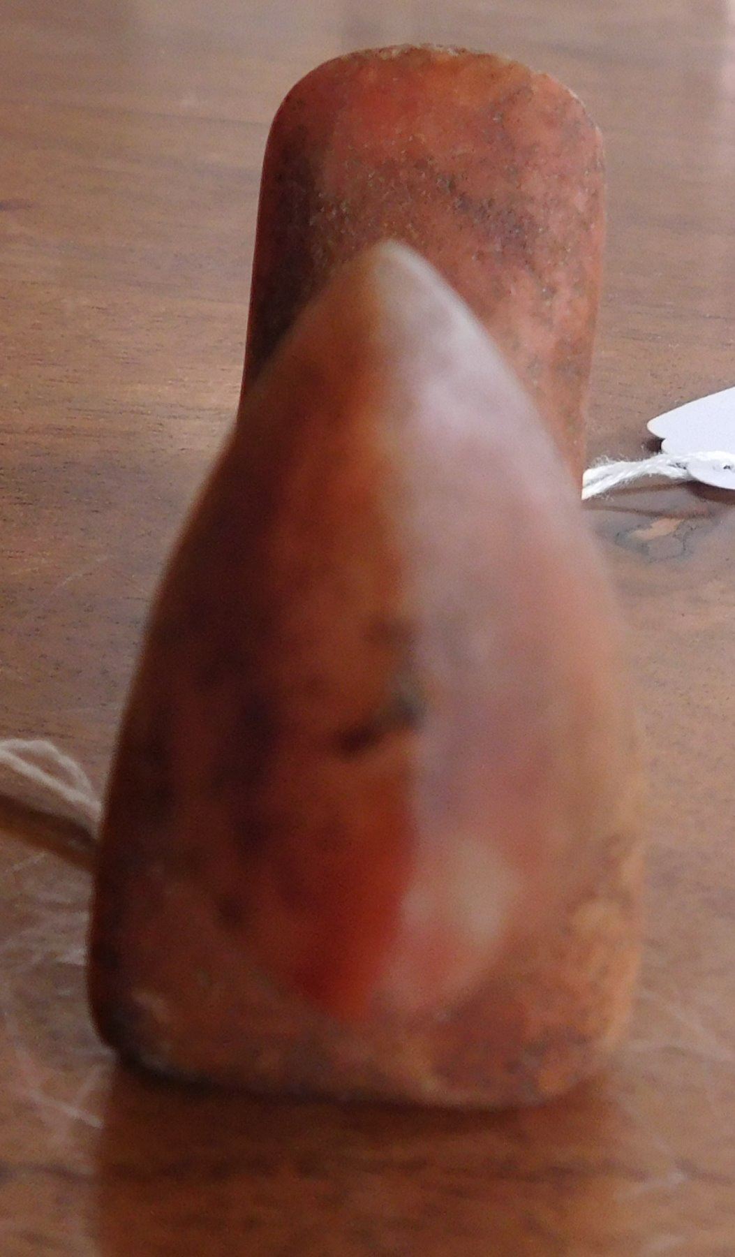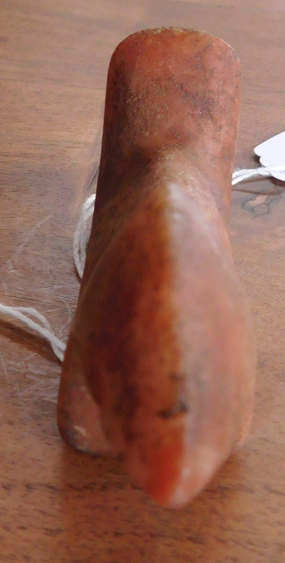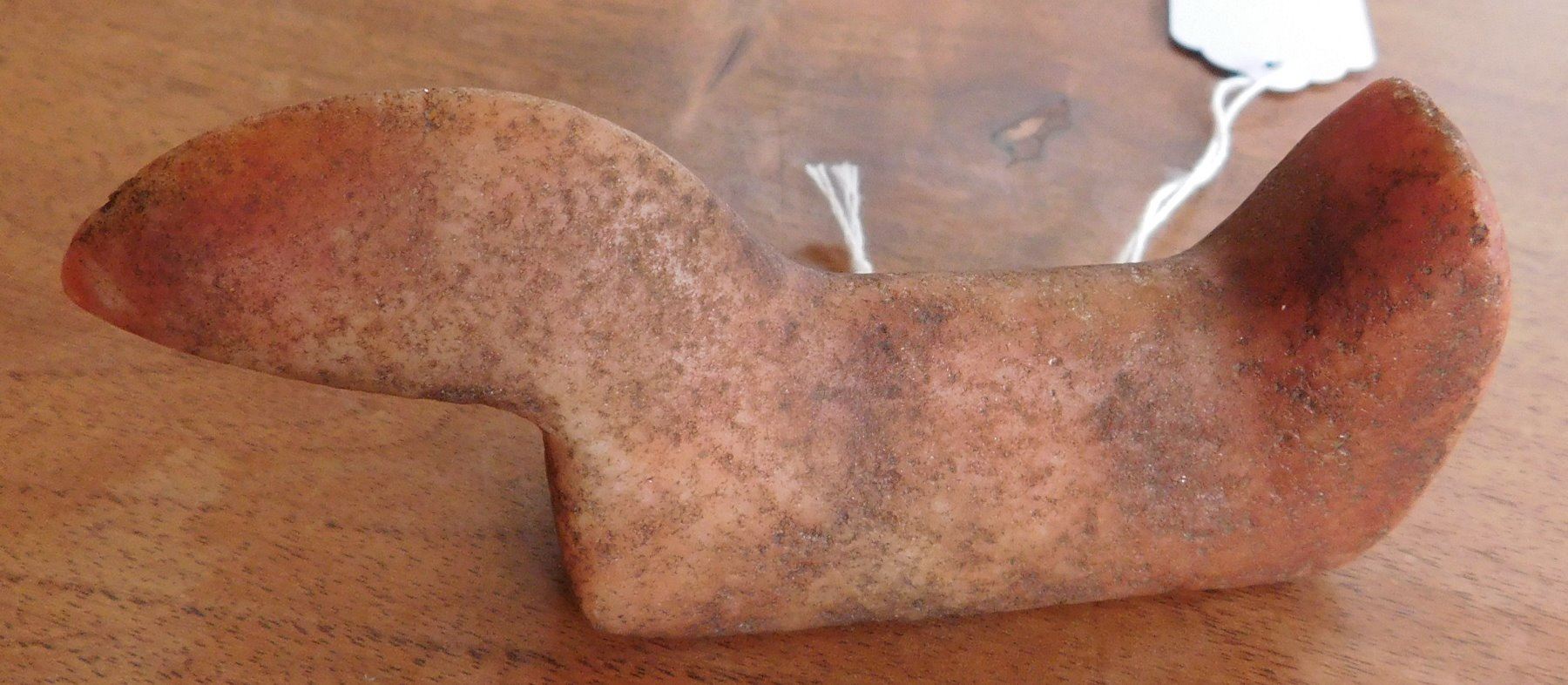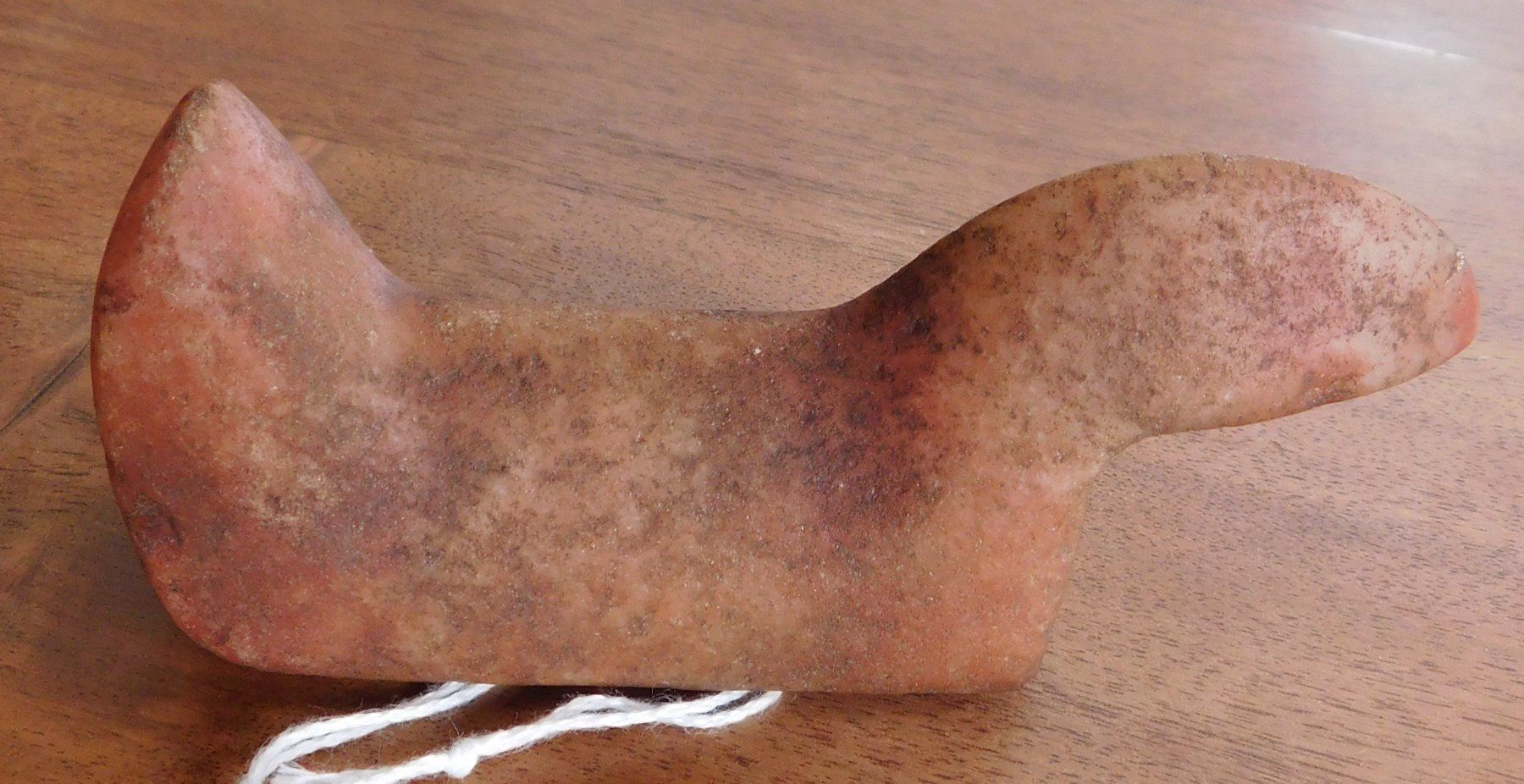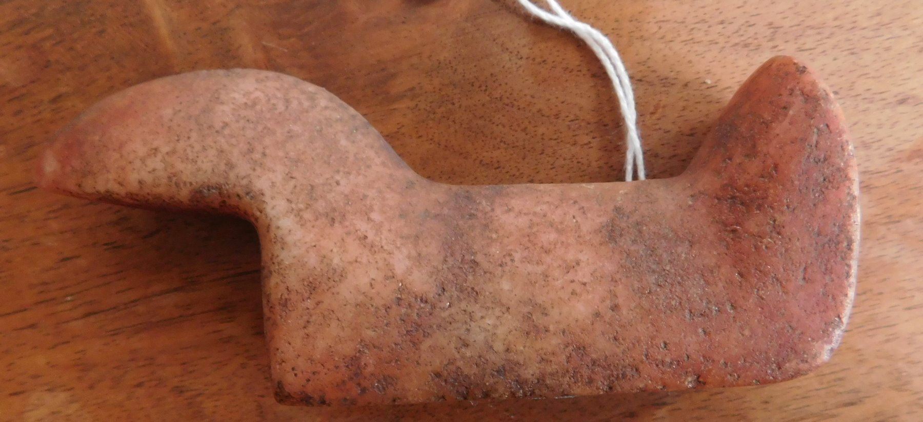 Birdstone, pre-historic item. Made of ferruginous quartz, the item measures 4 1/4" x 1 1/16" x 1 5/8". Undrilled, unfinished. Morgan County, Illinois. From an old, 1960s California collection. Condition: As found, good patina, see images. Shipping: $16.50 w/insurance and signature.