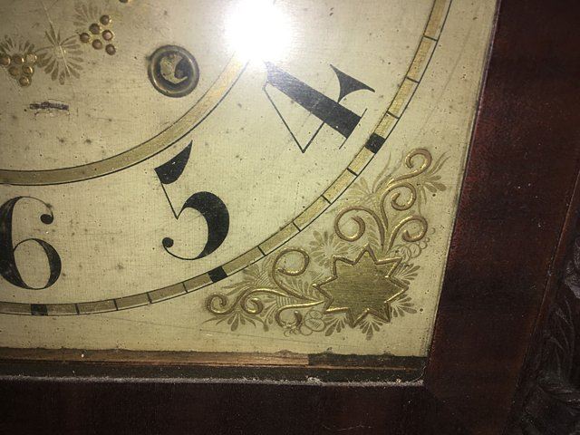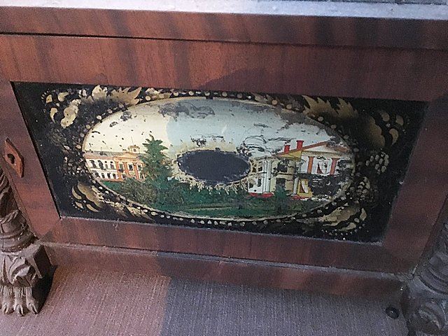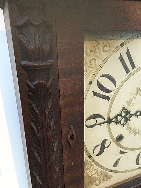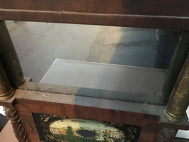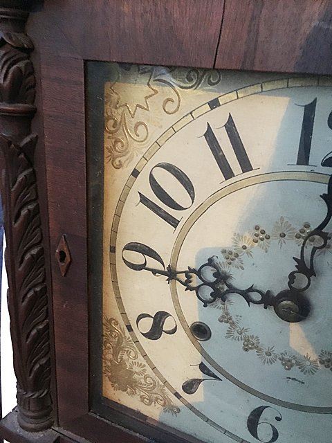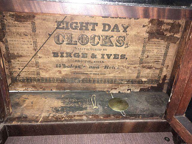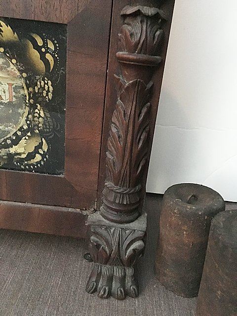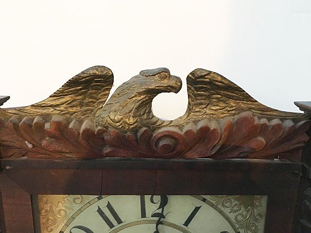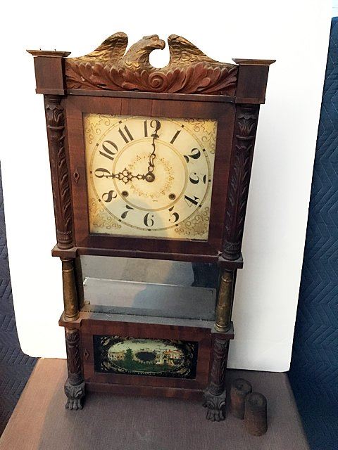 Birge and Ives triple decker 8 day shelf clock, Birge & Ives, Bristol, Conn., ca. 1830s, mahogany case with carved eagle splat, carved half columns and claw feet, hand painted dial, mirrored mid section between turned columns, reverse painted glass bottom tablet, painted wooden dial, measures approx. 35 1/2" tall x 17" wide x 4" deep.
