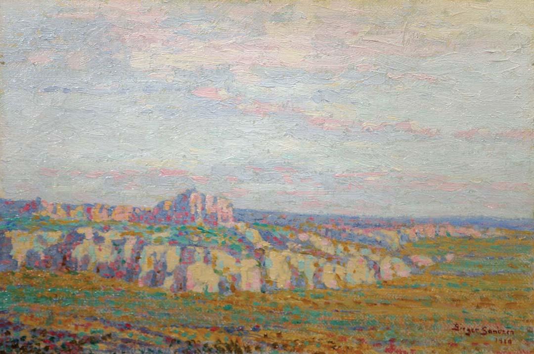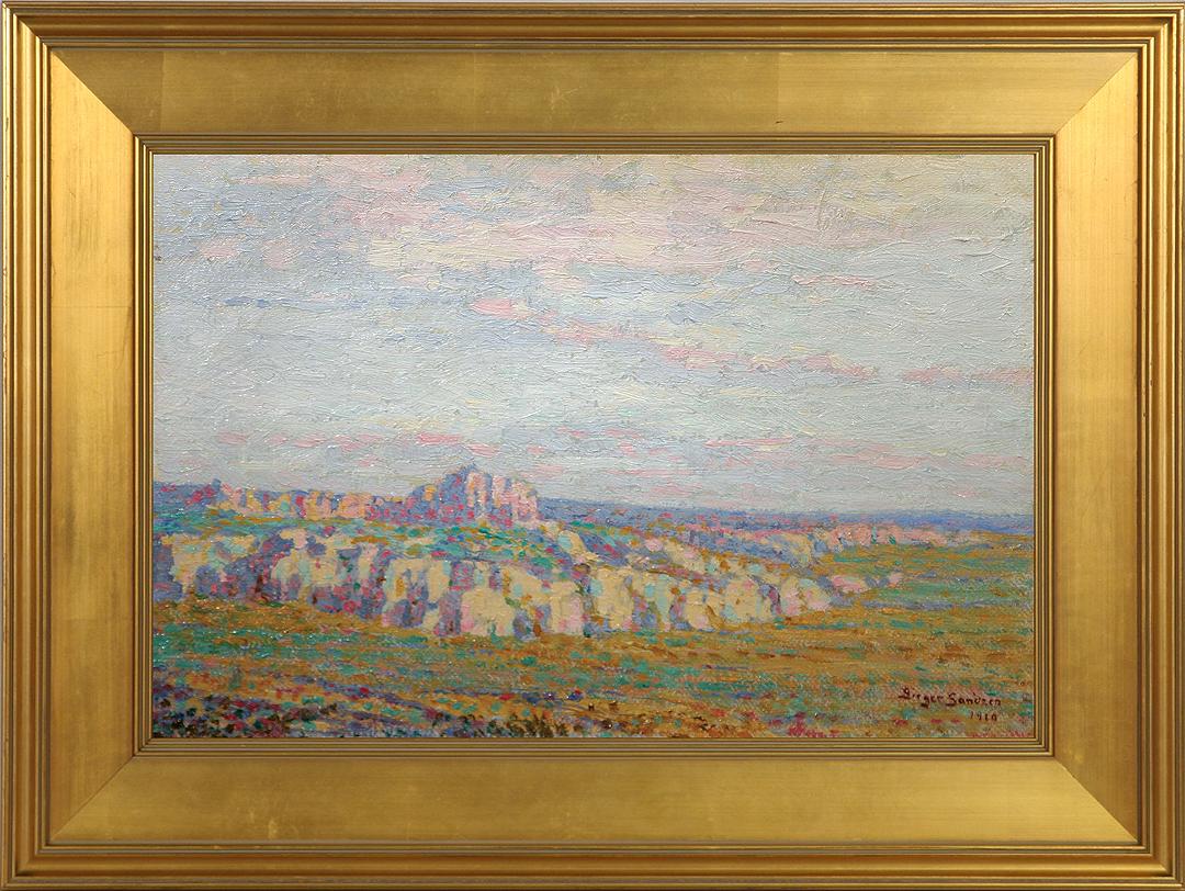 Birger Sandzén (1871-1954). Sunny Afternoon - Kansas. 12” x 18” oil on canvas . Executed 1910. Signed & dated lower right . Excellent condition. (est $15,000-25,000). In 1909 and 1910, Professor Sandzén experimented with the pointillist style that had become trademarks of noted artists George Seurat and Paul Signac. This pointillism period did not last long for Sandzen and his works done in this style are very difficult to find. Provenance: Bethany College, Lindsborg, KS. For condition reports please visit: www.auctioninsantafe.com/cr2011.pdf