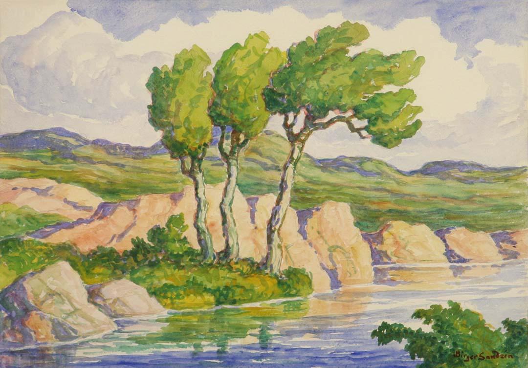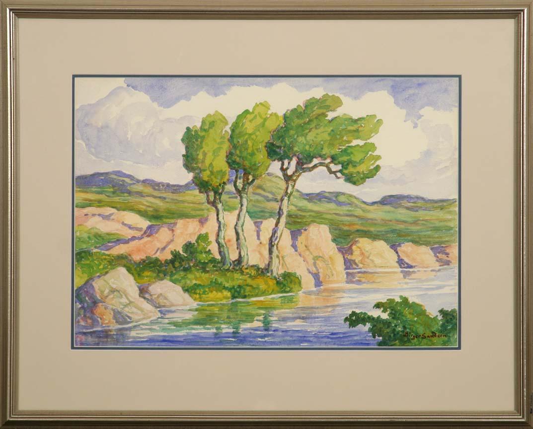 Birger Sandzén (1871-1954). Along Wild Horse Creek. 15” x 22” watercolor, . Executed in the 1930s or 1940s. Signed lower right. Bright and in fine condition. (est $5,000-10,000). . Provenance: Bethany College, Lindsborg, KS. . For condition reports please visit: www.auctioninsantafe.com/cr2011.pdf