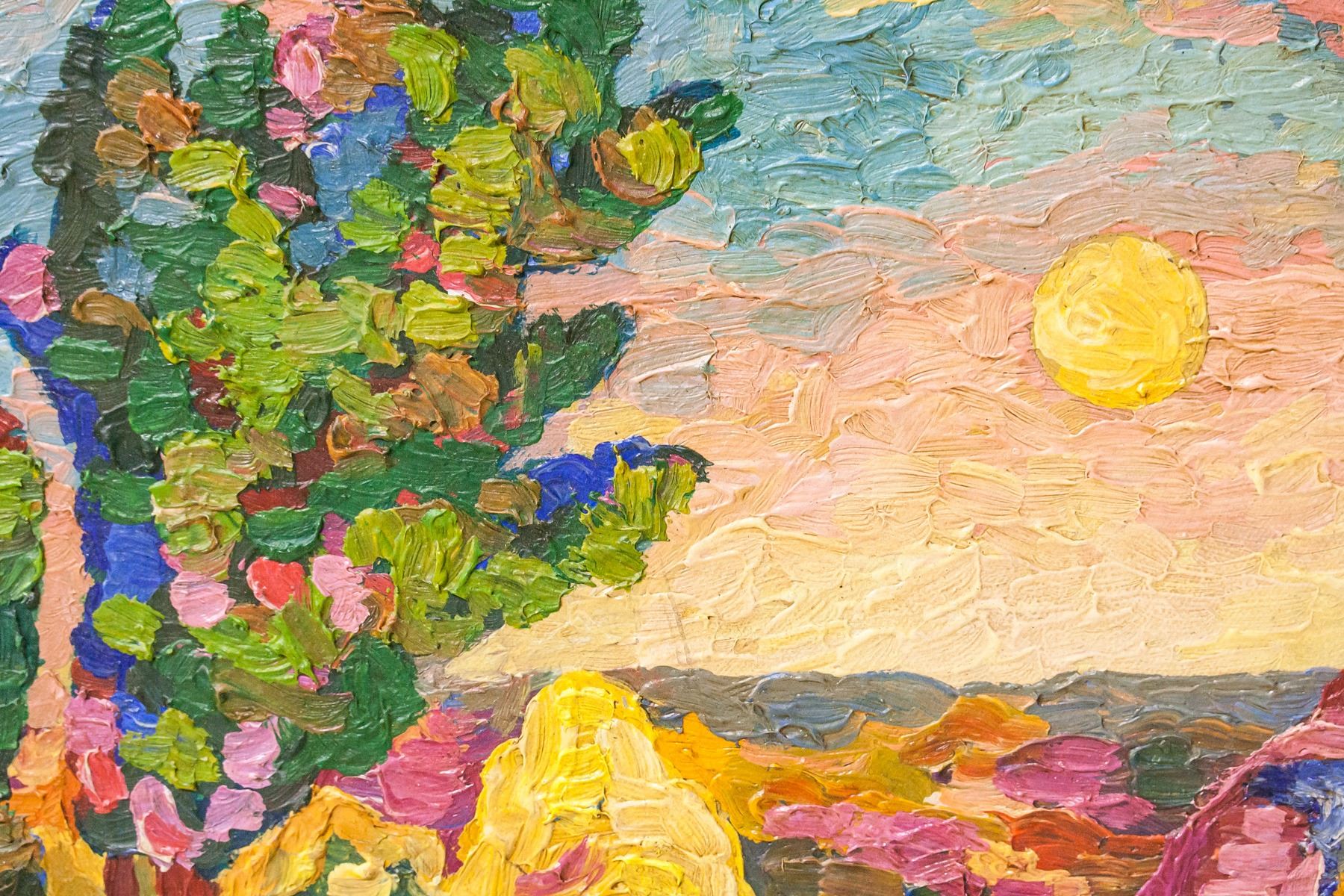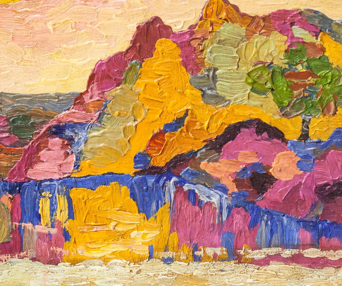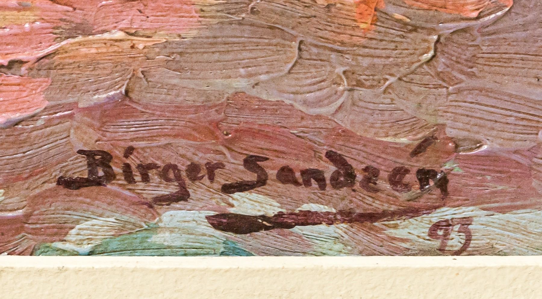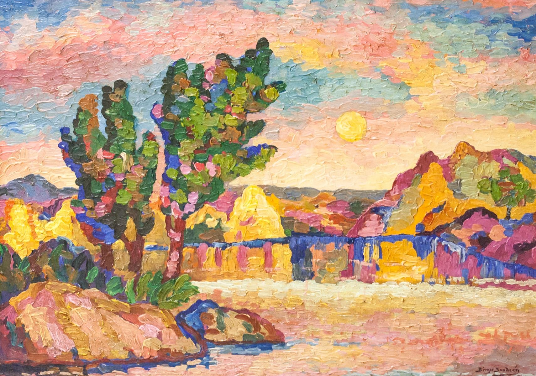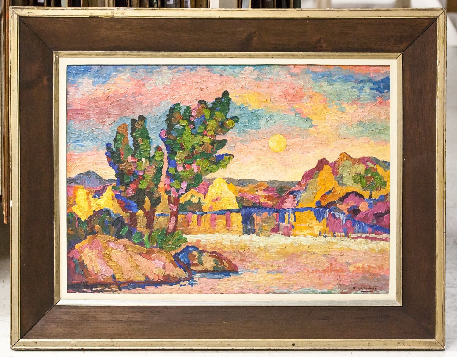 Oil on canvas, framed. Featuring modernist landscape scene. Signed "Birger Sandzen" in the bottom right corner, with "95" inscribed beneath the signature. Attributed to Birger Sandzen (1871-1954, American). Canvas size: 50 x 70 cm (19.75 x 27.5 inches). Frame size: 71 x9 1 cm (28 x 36 inches).